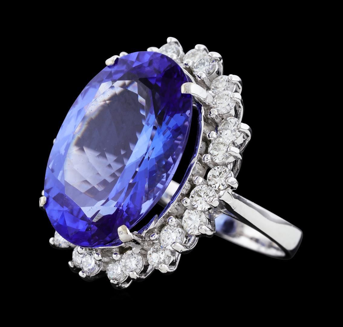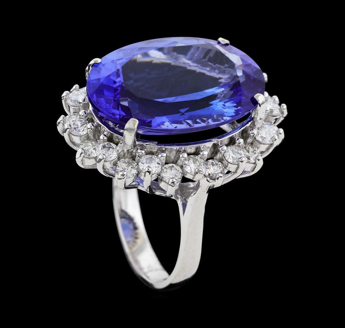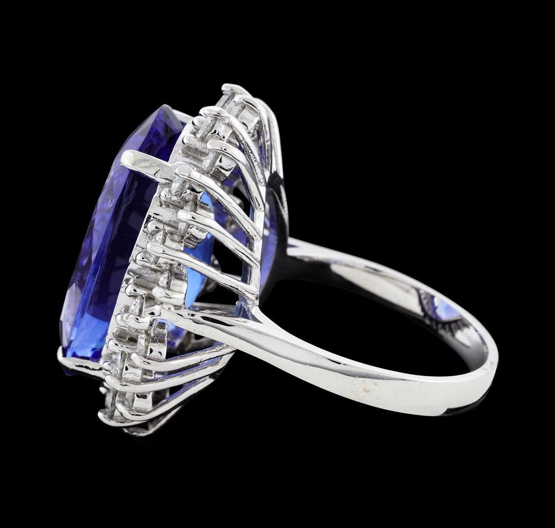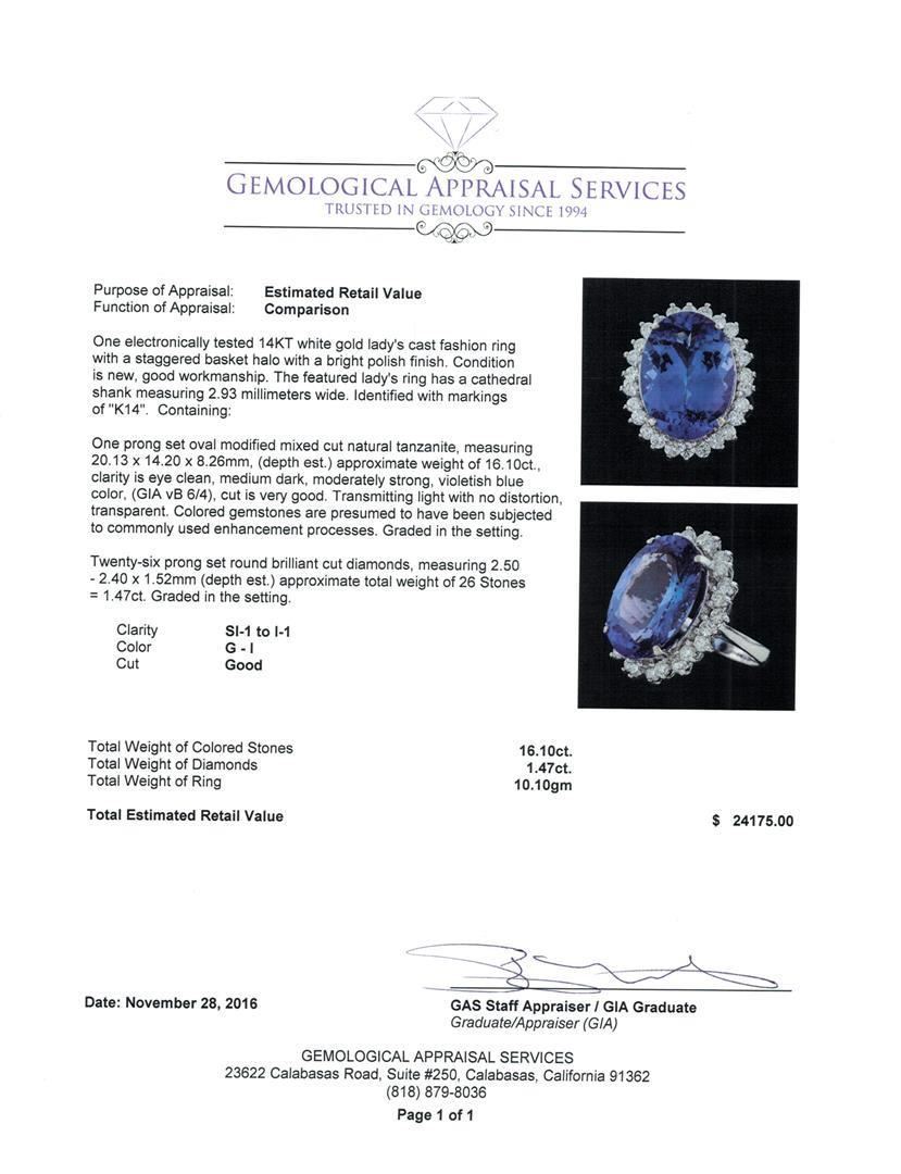 One electronically tested 14KT white gold lady's cast fashion ring with a staggered basket halo with a bright polish finish. The featured lady's ring has a cathedral shank measuring 2.93 millimeters wide. Identified with markings of 'K14'. Condition is new, good workmanship. Containing: One prong set oval modified mixed cut natural tanzanite, measuring 20.13 x 14.20 x 8.26mm, (depth est.) approximate weight of 16.10ct., clarity is eye clean, medium dark, moderately strong, violetish blue color, (GIA vB 6/4), cut is very good. Transmitting light with no distortion, transparent. Colored gemstones are presumed to have been subjected to commonly used enhancement processes. Graded in the setting. Twenty-Six prong set round brilliant cut diamonds, measuring 2.50 - 2.40 x 1.52mm (depth est.) approximate total weight of 26 Stones = 1.47ct. Graded in the setting. Clarity SI-1 to I-1. Color: G - I Cut Good. Total Weight of Colored Stones 16.10ct.. Total Weight of Diamonds 1.47ct.. Total Weight of Ring 10.10gm. GAS Appraised.