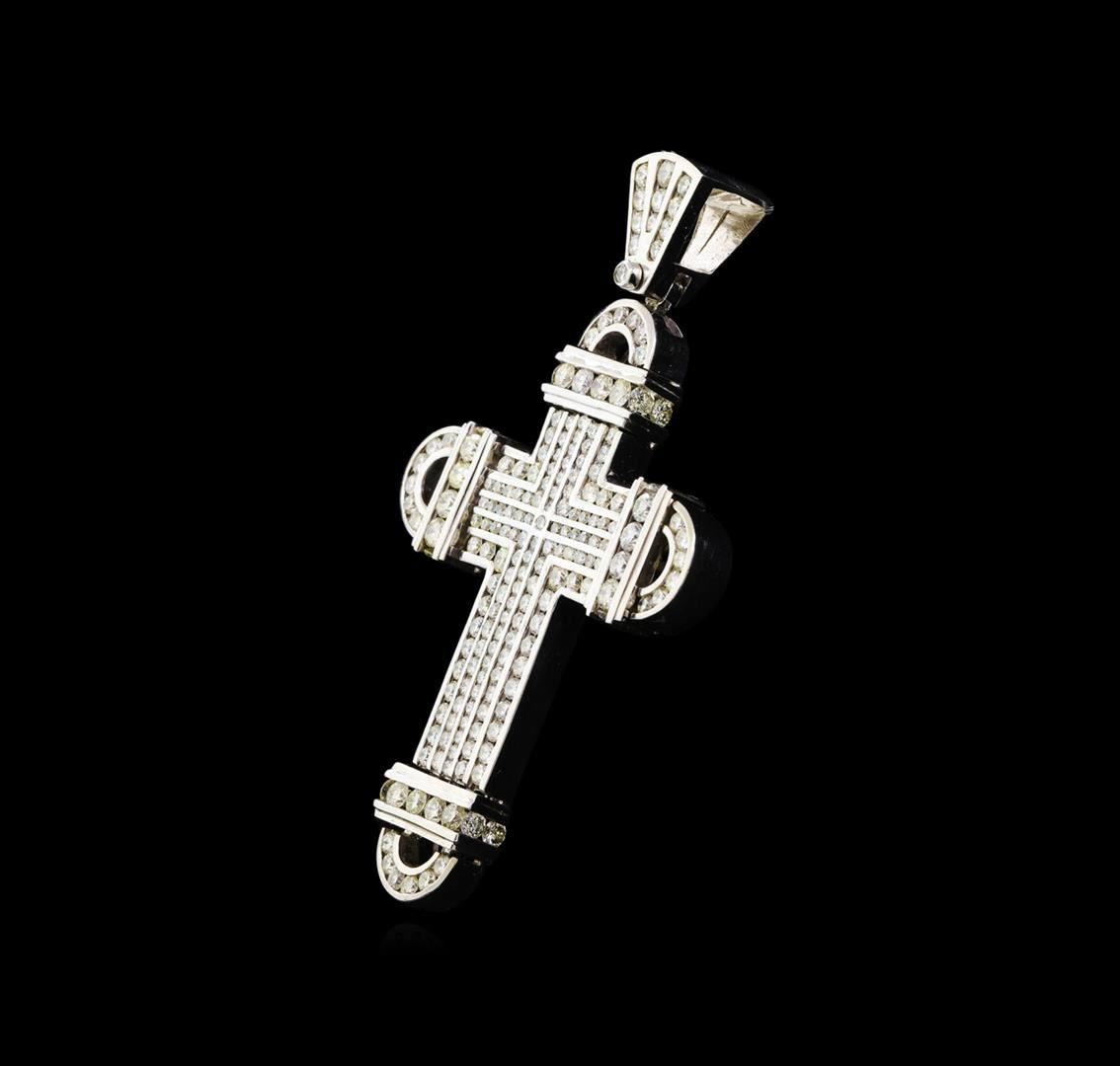One electronically tested 10KT white gold cast & assembled diamond cross pendant with a bright polish finish. The pendant features an elaborate diamond encrusted cross design supported by a lattice under gallery, completed by a diamond set bail. Area measurements 3.75 x 2.25 inch. Condition is good. Containing: Thirty-Five channel set round brilliant cut diamonds, measuring 3.80 - 3.70 x 2.25mm (depth est.) approximate total weight of 35 Stones = 6.85ct. The color grade reflects the entire range of color for this group. Graded in the setting. Clarity: SI-2 to I-1 . Color: I - L Seventy-Three channel set round brilliant cut diamonds, measuring 3.00. - 2.70 x 1.71mm (depth est.) approximate total weight of 73 Stones = 6.24ct. Graded in the setting. Clarity: SI-2 to I-1 . Color: H - J Ninety channel set round brilliant cut diamonds, measuring 2.30 - 1.90 x 1.26mm (depth est.) approximate total weight of 90 Stones = 3.15ct. Graded in the setting. Clarity: SI-2 to I-1 . Color: H - J. Total Weight of Diamonds 16.24ct.. Total Weight of Pendant 74.13gm. AIG Appraised.