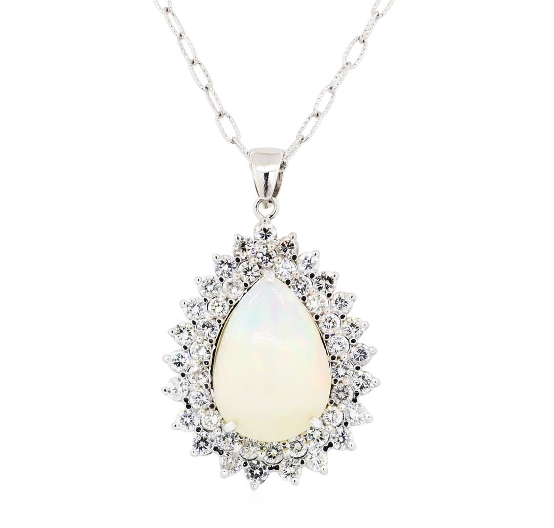 One electronically tested 14KT white gold lady's combination cast & assembled fashion pendant & chain 19.0' long, 2.5mm twisted oval shape link with a lobster claw clasp with a double basket halo with a bright polish finish. Identified with markings of '14K'. Condition is new, good workmanship. Containing: One crystal opal that is cut in a pear shaped cabochon and is prong set, measuring 22.50 mm long x 15.70 mm wide, and 11.52 mm thick and the approximate weight is 16.34 carats. The opal has a bright, multicolor play of color (fire) in a rolling flashfire pattern; a high dome; a good cut; slightly included; major dull spot in its brightness and pattern; and is not directional. Colored gemstones are presumed to have been subjected to commonly used enhancement processes. Graded in the setting. Forty-Five prong set round brilliant cut diamonds, measuring 3.00 - 2.90 x 1.83mm (depth est.) approximate total weight of 45 Stones = 4.50ct. Graded in the setting. Color H - I Clarity SI-1 to I-1 Cut Good. Total Weight of Diamonds 4.50ct.. Total Weight of Opals 16.34ct.. Total Weight of Pendant & Chain 16.30gm GAS Appraised at $14155.00. GAS Appraised.