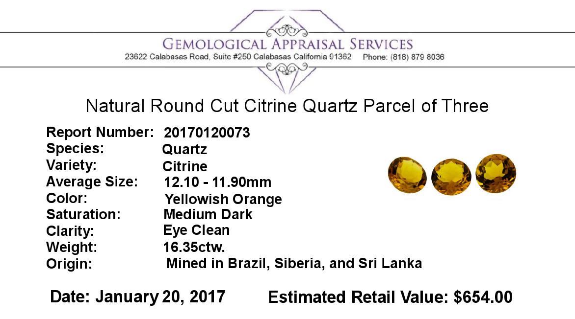 One natural round cut citrine quartz parcel of three with an exact weight of 16.35ctw., clarity is eye clean, yellowish orange, medium dark. Gemological Appraisals Services estimates the retail value at $654 GAS Appraised.