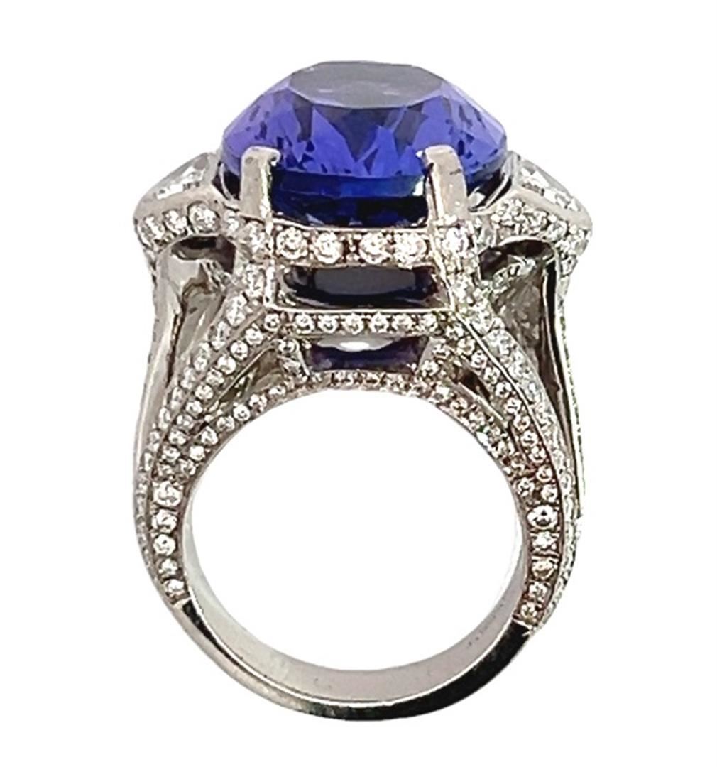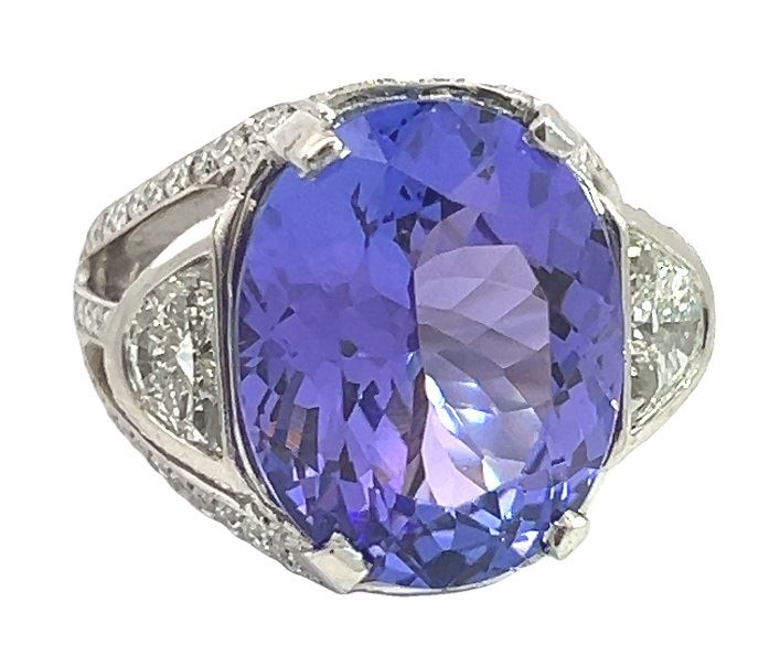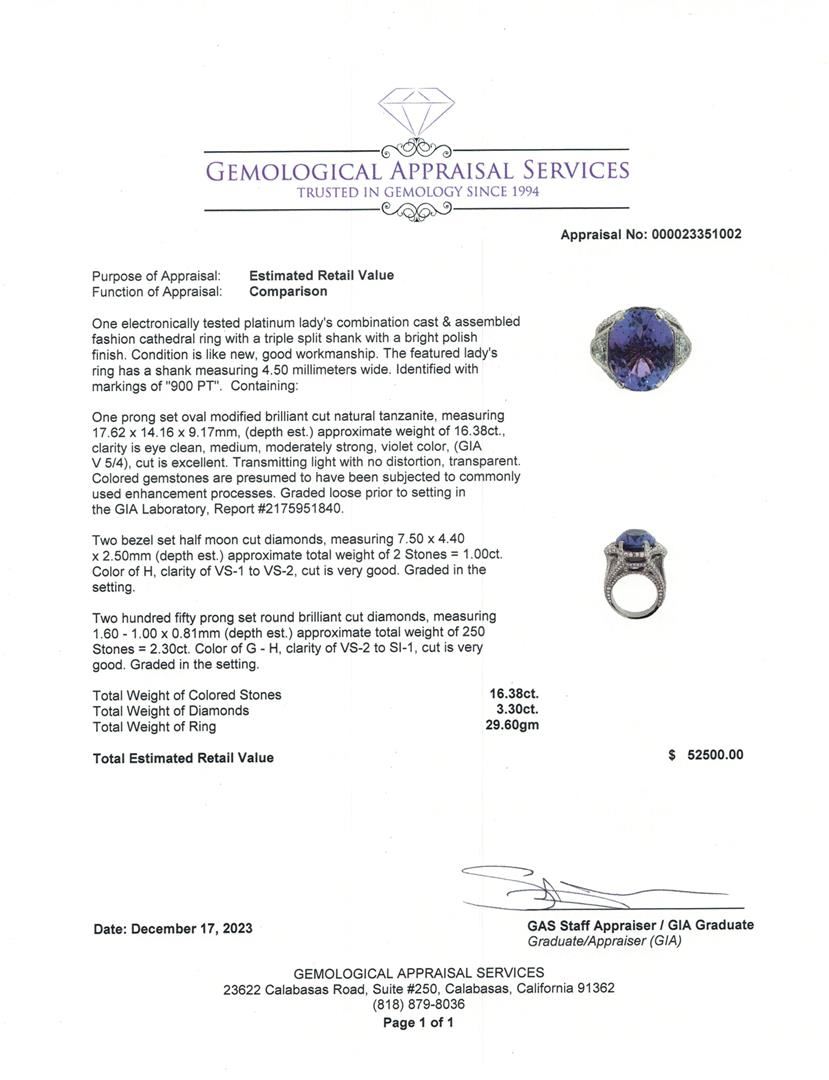 One electronically tested platinum lady's combination cast & assembled fashion cathedral ring with a triple split shank with a bright polish finish. The featured lady's ring has a shank measuring 4.50 millimeters wide. Identified with markings of "900 PT". Condition is like new, good workmanship.Containing: One prong set oval modified brilliant cut natural tanzanite, measuring 17.62 x 14.16 x 9.17mm, (depth est.) approximate weight of 16.38ct., clarity is eye clean, medium, moderately strong, violet color, (GIA V 5/4), cut is excellent. Transmitting light with no distortion, transparent. Colored gemstones are presumed to have been subjected to commonly used enhancement processes. Graded loose prior to setting in the GIA Laboratory, Report #2175951840.Two bezel set half moon cut diamonds, measuring 7.50 x 4.40 x 2.50mm (depth est.) approximate total weight of 2 Stones = 1.00ct. Graded in the setting.Color HClarity VS-1 to VS-2 Cut Very Good Two Hundred Fifty prong set round brilliant cut diamonds, measuring 1.60 - 1.00 x 0.81mm (depth est.) approximate total weight of 250 Stones = 2.30ct. Graded in the setting.Color G - HClarity VS-2 to SI-1 Cut Very Good Total Weight of Colored Stones 16.38ct. Total Weight of Diamonds 3.30ct. Total Weight of Ring 29.60gm Estimated Retail Value 52500