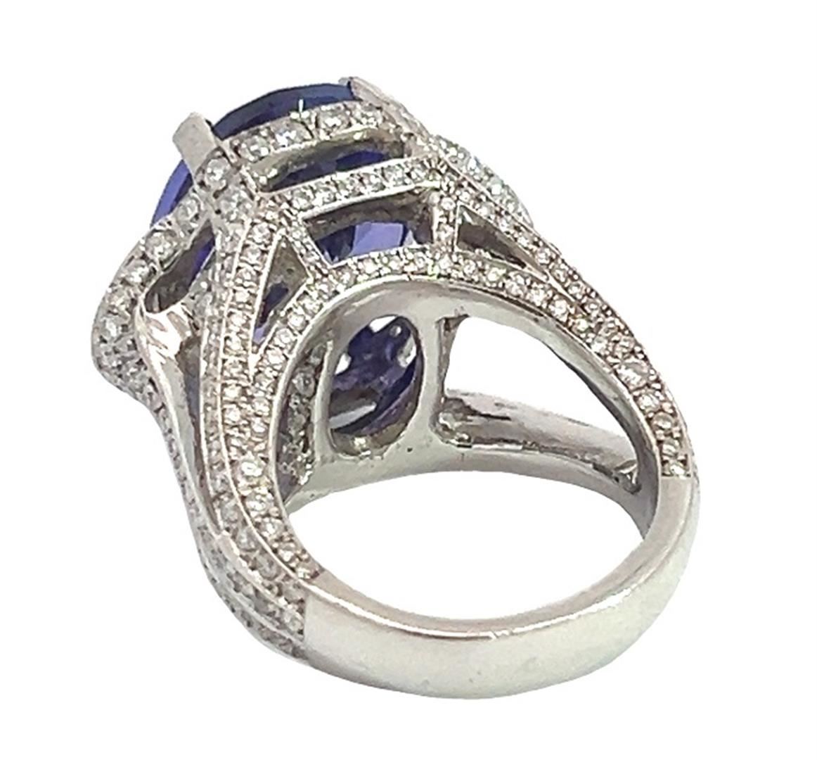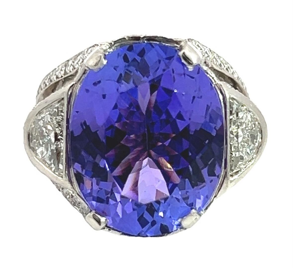One electronically tested platinum lady's combination cast & assembled fashion cathedral ring with a triple split shank with a bright polish finish. The featured lady's ring has a shank measuring 4.50 millimeters wide. Identified with markings of "900 PT". Condition is like new, good workmanship.Containing: One prong set oval modified brilliant cut natural tanzanite, measuring 17.62 x 14.16 x 9.17mm, (depth est.) approximate weight of 16.38ct., clarity is eye clean, medium, moderately strong, violet color, (GIA V 5/4), cut is excellent. Transmitting light with no distortion, transparent. Colored gemstones are presumed to have been subjected to commonly used enhancement processes. Graded loose prior to setting in the GIA Laboratory, Report #2175951840.Two bezel set half moon cut diamonds, measuring 7.50 x 4.40 x 2.50mm (depth est.) approximate total weight of 2 Stones = 1.00ct. Graded in the setting.Color HClarity VS-1 to VS-2 Cut Very Good Two Hundred Fifty prong set round brilliant cut diamonds, measuring 1.60 - 1.00 x 0.81mm (depth est.) approximate total weight of 250 Stones = 2.30ct. Graded in the setting.Color G - HClarity VS-2 to SI-1 Cut Very Good Total Weight of Colored Stones 16.38ct. Total Weight of Diamonds 3.30ct. Total Weight of Ring 29.60gm Estimated Retail Value 52500