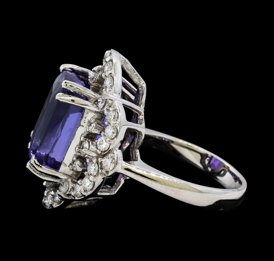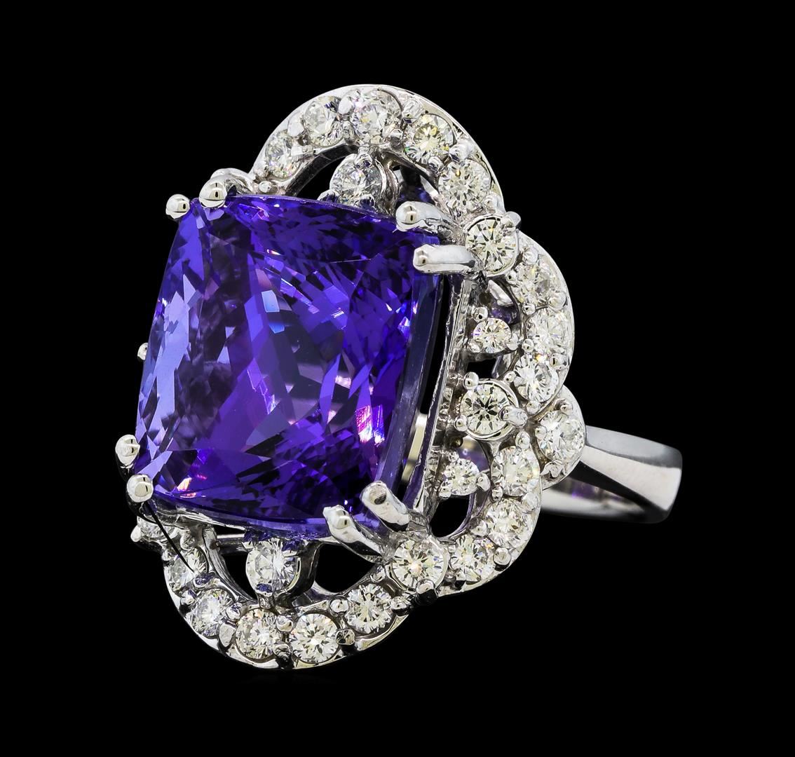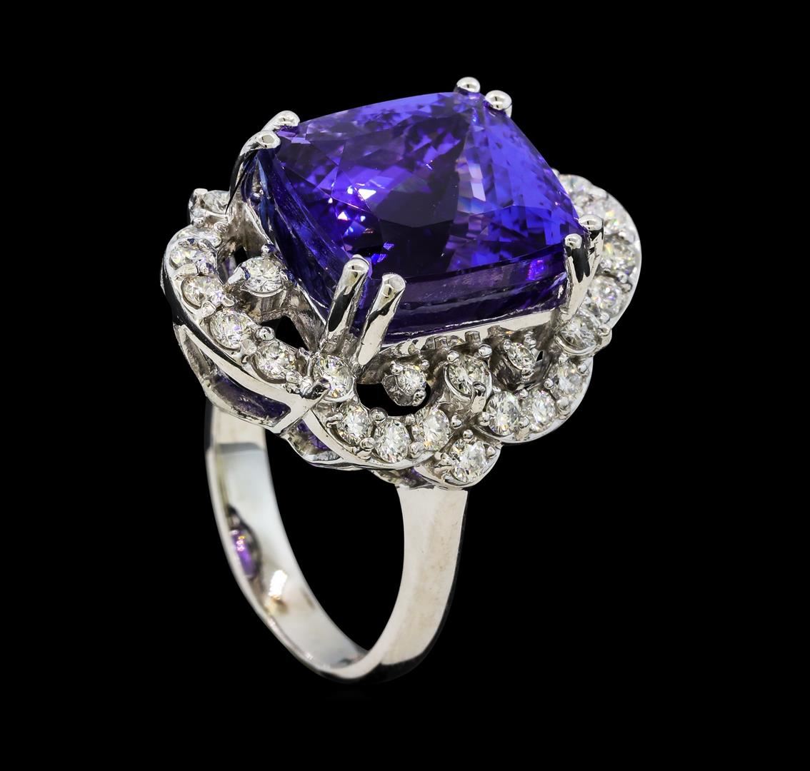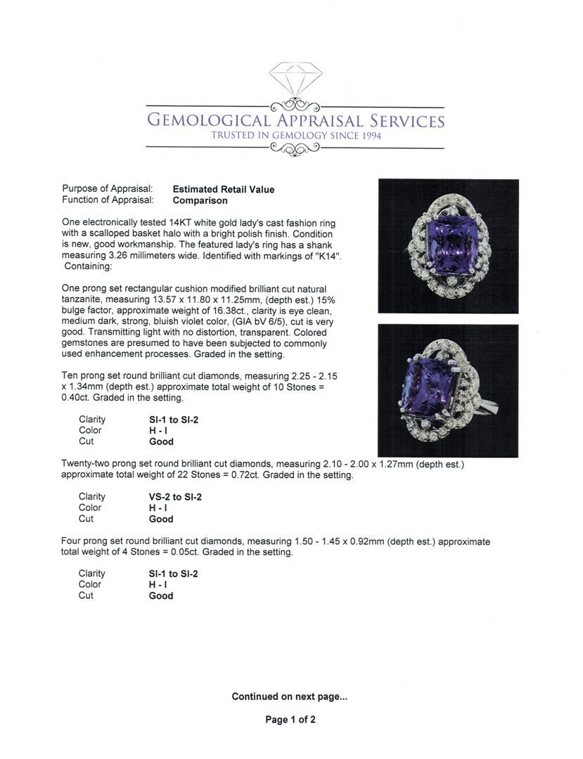 One electronically tested 14KT white gold lady's cast fashion ring with a scalloped basket halo with a bright polish finish. The featured lady's ring has a shank measuring 3.26 millimeters wide. Identified with markings of 'K14'. Condition is new, good workmanship. Containing: One prong set rectangular cushion modified brilliant cut natural tanzanite, measuring 13.57 x 11.80 x 11.25mm, (depth est.) 15%. bulge factor, approximate weight of 16.38ct., clarity is eye clean, medium dark, strong, bluish violet color, (GIA bV 6/5), cut is very good. Transmitting light with no distortion, transparent. Colored gemstones are presumed to have been subjected to commonly used enhancement processes. Graded in the setting. Ten prong set round brilliant cut diamonds, measuring 2.25 - 2.15 x 1.34mm (depth est.) approximate total weight of 10 Stones = 0.40ct. Graded in the setting. Clarity SI-1 to SI-2. Color: H - I Cut Good Twenty-Two prong set round brilliant cut diamonds, measuring 2.10 - 2.00 x 1.27mm (depth est.) approximate total weight of 22 Stones = 0.72ct. Graded in the setting. Clarity VS-2 to SI-2. Color: H - I Cut Good Four prong set round brilliant cut diamonds, measuring 1.50 - 1.45 x 0.92mm (depth est.) approximate total weight of 4 Stones = 0.05ct. Graded in the setting. Clarity SI-1 to SI-2. Color: H - I Cut Good. Total Weight of Colored Stones 16.38ct.. Total Weight of Diamonds 1.17ct.. Total Weight of Ring 11.70gm. GAS Appraised at $24,620.00.