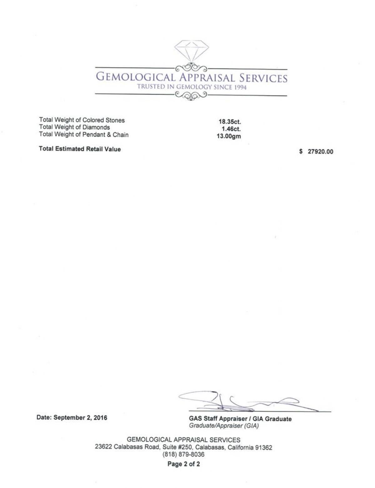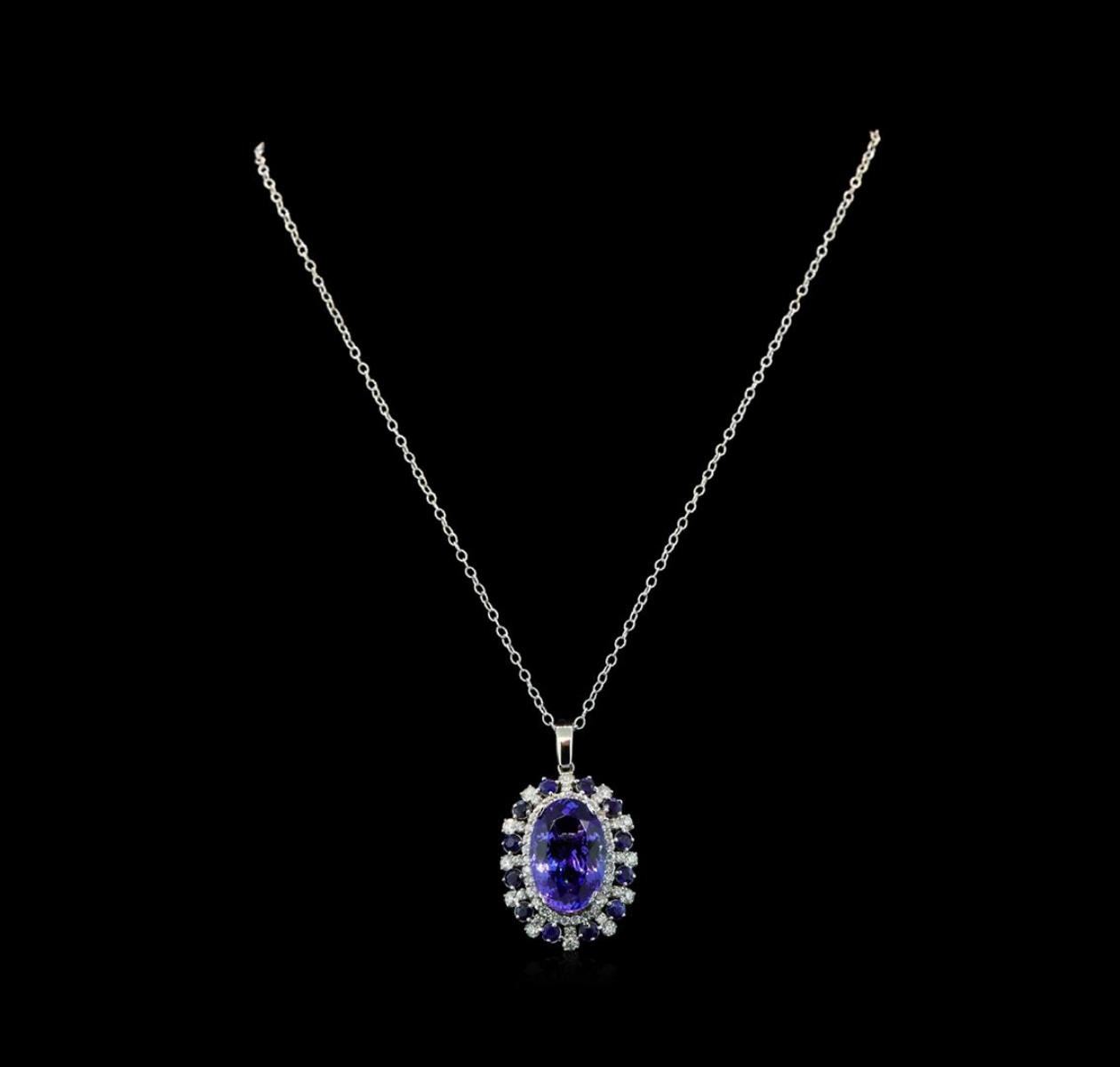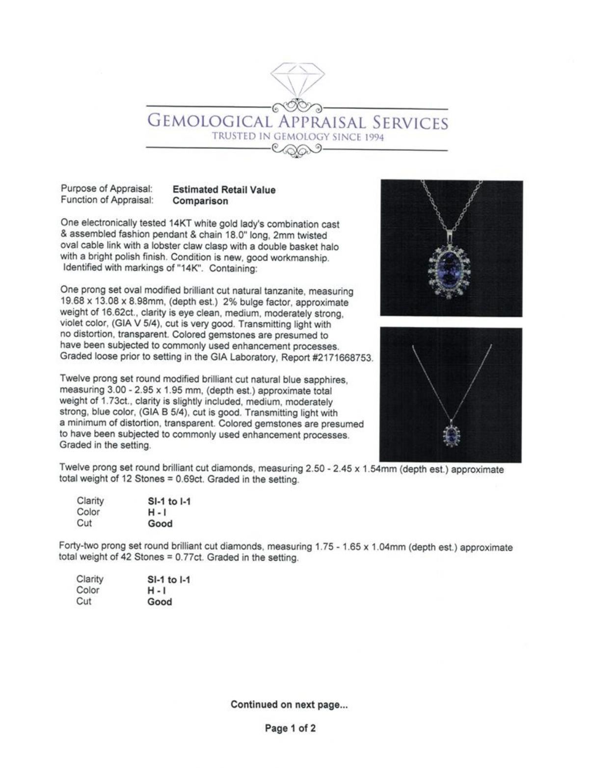 One electronically tested 14KT white gold lady's combination cast & assembled fashion pendant & chain 18.0' long, 2mm twisted oval cable link with a lobster claw clasp with a double basket halo with a bright polish finish. Identified with markings of '14K'. Condition is new, good workmanship. Containing: One prong set oval modified brilliant cut natural tanzanite, measuring 19.68 x 13.08 x 8.98mm, (depth est.) 2%. bulge factor, approximate weight of 16.62ct., clarity is eye clean, medium, moderately strong, violet color, (GIA V 5/4), cut is very good. Transmitting light with no distortion, transparent. Colored gemstones are presumed to have been subjected to commonly used enhancement processes. Graded loose prior to setting in the GIA Laboratory, Report #2171668753. Twelve prong set round modified brilliant cut natural blue sapphires, measuring 3.00 - 2.95 x 1.95 mm, (depth est.) approximate total weight of 1.73ct., clarity is slightly included, medium, moderately strong, blue color, (GIA B 5/4), cut is good. Transmitting light with a minimum of distortion, transparent. Colored gemstones are presumed to have been subjected to commonly used enhancement processes. Graded in the setting. Twelve prong set round brilliant cut diamonds, measuring 2.50 - 2.45 x 1.54mm (depth est.) approximate total weight of 12 Stones = 0.69ct. Graded in the setting. Clarity SI-1 to I-1. Color: H - I Cut Good Forty-Two prong set round brilliant cut diamonds, measuring 1.75 - 1.65 x 1.04mm (depth est.) approximate total weight of 42 Stones = 0.77ct. Graded in the setting. Clarity SI-1 to I-1. Color: H - I Cut Good. Total Weight of Colored Stones 18.35ct.. Total Weight of Diamonds 1.46ct.. Total Weight of Pendant & Chain 13.00gm GAS Appraised at $27,920.00.