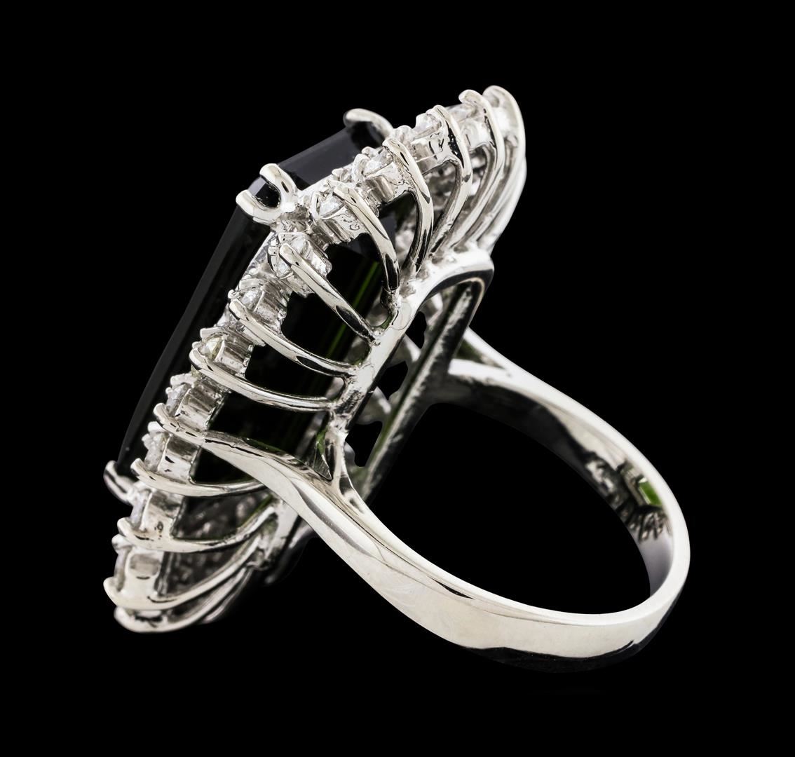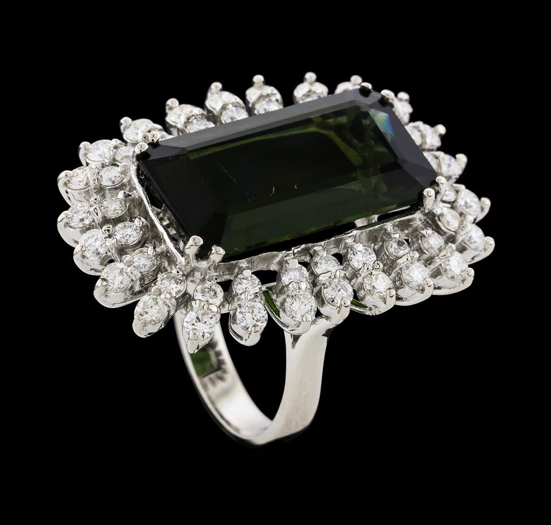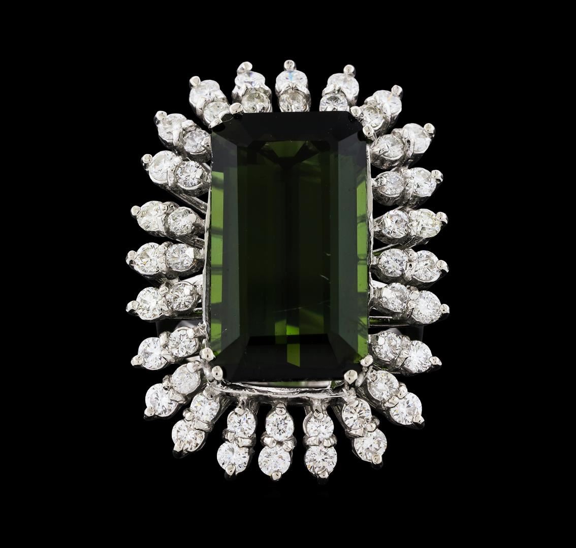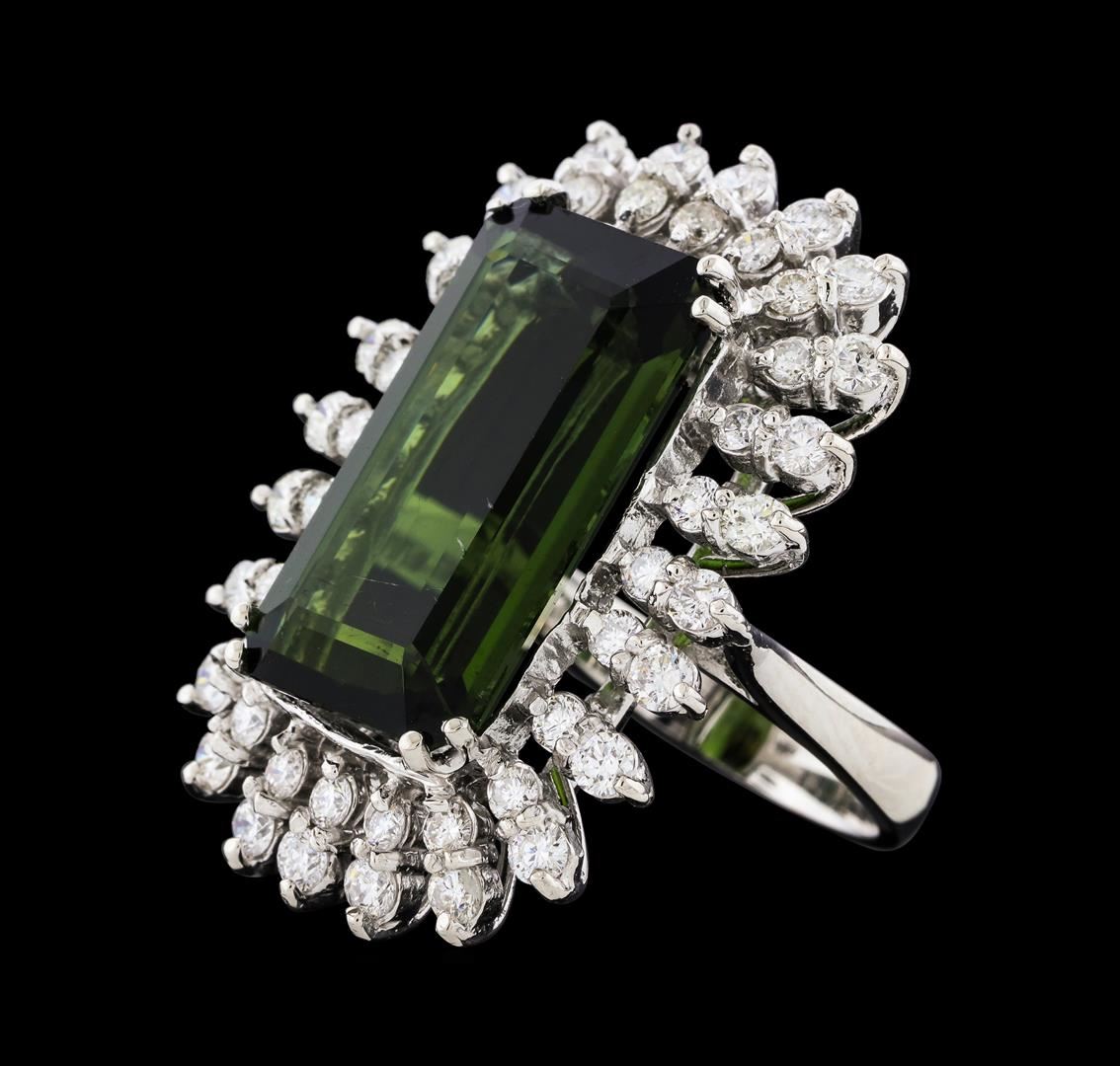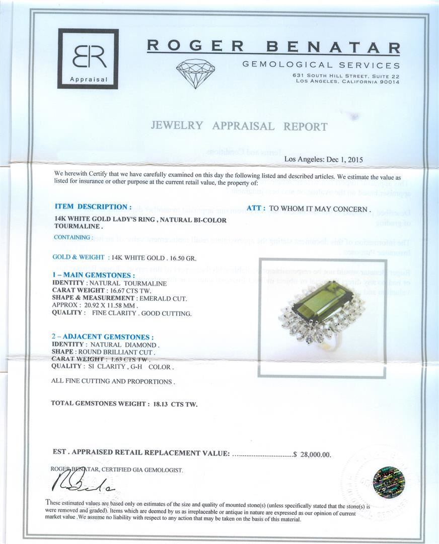 One 14KT White Gold Lady's Ring, Natural Bi-Color Tourmaline. Containing: Gold & Weight: 14KT White Gold: 16.50 grams. Main Gemstones: Identity: Natural Tourmaline, Carat Weight: 16.67cts tw, Shape & Measurement: Emerald Cut. Approximately: 20.92 x 11.58mm, Quality: Fine Clarity. Good Cutting. Adjacent Gemstones: Identity: Natural Diamond, Shape: Round Brilliant Cut, Carat Weight: 1.63 cts tw, Quality: SI Clarity. G-H Color. All fine cutting and proportions. Total Gemstones weight: 18.13 cts tw. RBGS Appraised at $28,000.00.