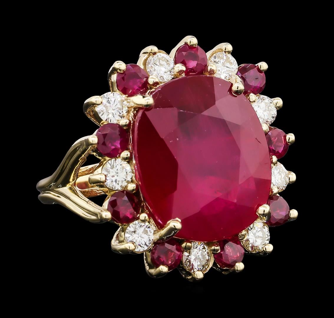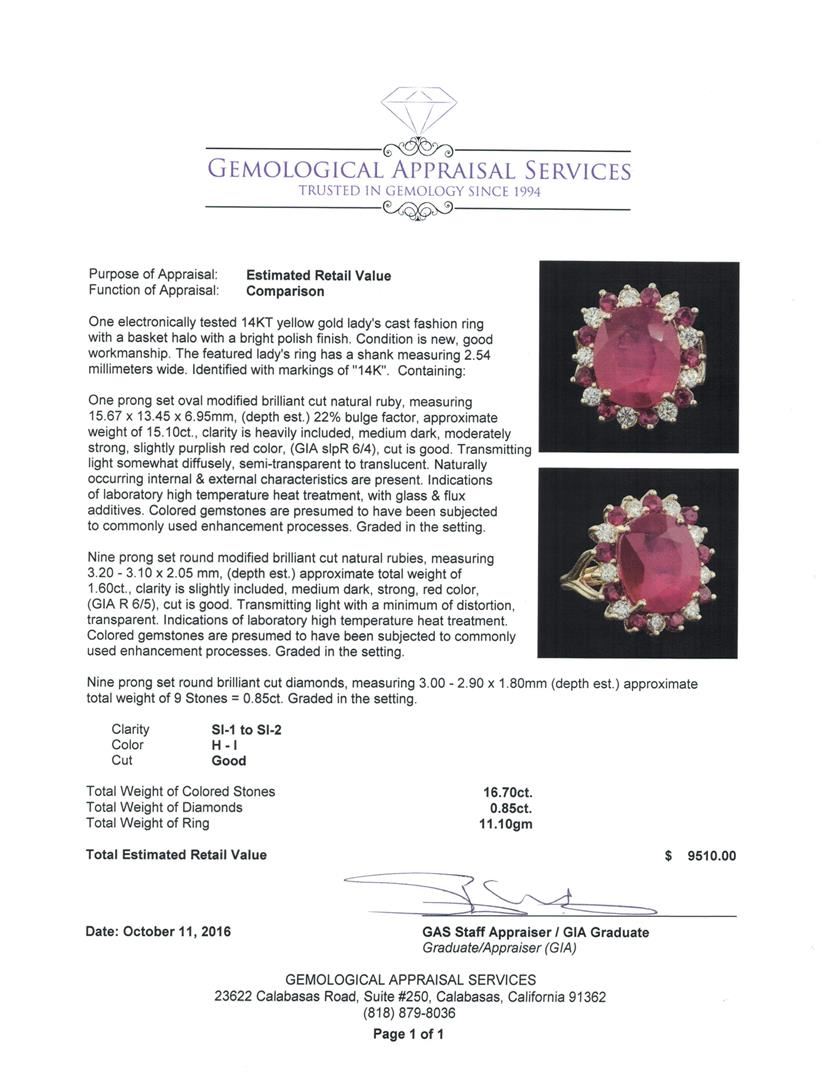 One electronically tested 14KT yellow gold lady's cast fashion ring with a basket halo with a bright polish finish. The featured lady's ring has a shank measuring 2.54 millimeters wide. Identified with markings of '14K'. Condition is new, good workmanship. Containing: One prong set oval modified brilliant cut natural ruby, measuring 15.67 x 13.45 x 6.95mm, (depth est.) 22%. bulge factor, approximate weight of 15.10ct., clarity is heavily included, medium dark, moderately strong, slightly purplish red color, (GIA slpR 6/4), cut is good. Transmitting light somewhat diffusely, semi-transparent to translucent. Naturally occurring internal & external characteristics are present. Indications of laboratory high temperature heat treatment, with glass & flux additives. Colored gemstones are presumed to have been subjected to commonly used enhancement processes. Graded in the setting. Nine prong set round modified brilliant cut natural rubies, measuring 3.20 - 3.10 x 2.05 mm, (depth est.) approximate total weight of 1.60ct., clarity is slightly included, medium dark, strong, red color, (GIA R 6/5), cut is good. Transmitting light with a minimum of distortion, transparent. Indications of laboratory high temperature heat treatment. Colored gemstones are presumed to have been subjected to commonly used enhancement processes. Graded in the setting. Nine prong set round brilliant cut diamonds, measuring 3.00 - 2.90 x 1.80mm (depth est.) approximate total weight of 9 Stones = 0.85ct. Graded in the setting. Clarity SI-1 to SI-2. Color: H - I Cut Good. Total Weight of Colored Stones 16.70ct.. Total Weight of Diamonds 0.85ct.. Total Weight of Ring 11.10gm. GAS Appraised at $9,510.00.