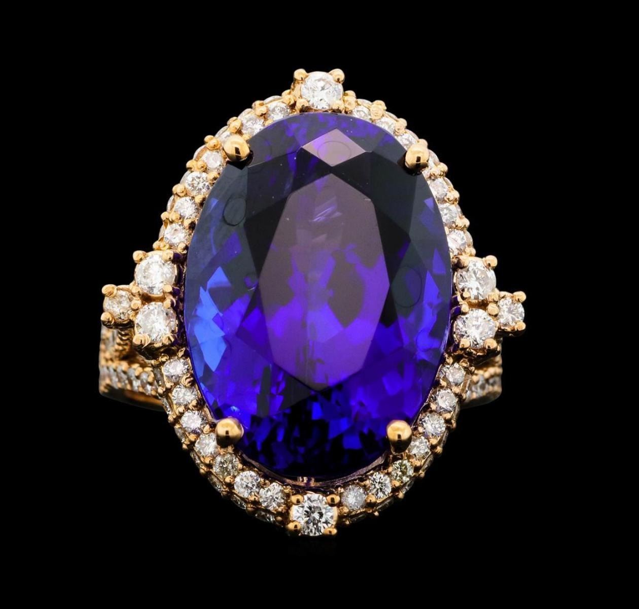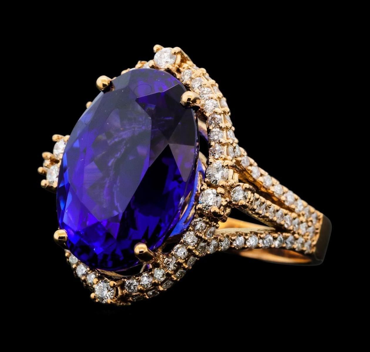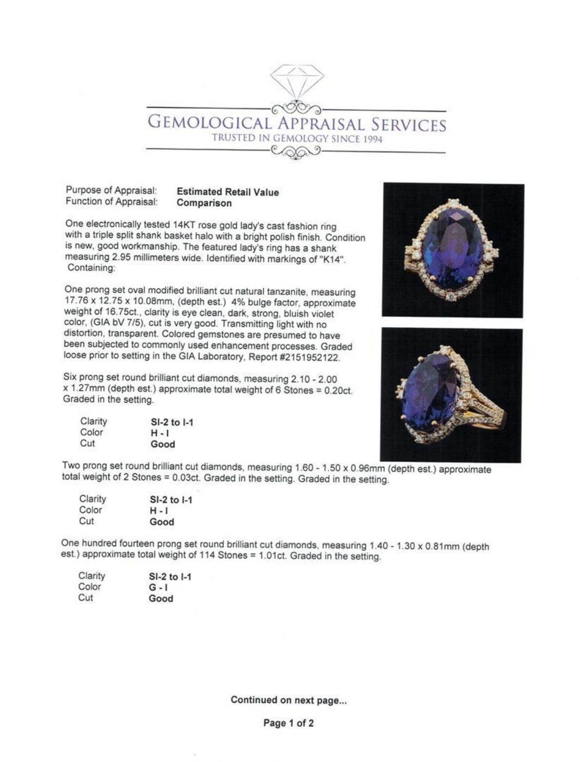 One electronically tested 14KT rose gold lady's cast fashion ring with a triple split shank basket halo with a bright polish finish. Condition is new, good workmanship. The featured lady's ring has a shank measuring 2.95 millimeters wide. identi?ed with markings of "K14". Containing: One prong set oval modified brilliant cut natural tanzanite, measuring 17.76 x 12.75 x 10.08mm, (depth est.) 4% bulge factor, approximate weight of 16.75ct., clarity is eye clean, dark, strong, bluish violet color, (GIA bV 7/5), cut is very good. Transmitting light with no distortion, transparent. Colored gemstones are presumed to have been subjected to commonly used enhancement processes. Graded loose prior to setting in the GIA Laboratory, Report #2151952122. Six prong set round brilliant out diamonds, measuring 2.10 - 2.00 x 1.27mm (depth est.) approximate total weight of 6 Stones = 0.20ct Graded in the setting. Clarity SI-2 to I-1 Color H - I Cut Good Two prong set round brilliant cut diamonds, measuring 1.60 - 1.50 x 0.96mm (depth est.) approximate total weight of 2 Stones = 0.03ct. Graded in the setting, Graded in the setting. Clarlty SI-2 to l-1 Color H - I Cut Good. One hundred fourteen prong set round brilliant cut diamonds, measuring 1.40 - 1.30 x 0.81mm (depth est.) approximate total weight of 114 Stones = 1.01ct. Graded in the setting. Clarity SI-2 to I-1 Color G - I Cut Good Total Weight of Colored Stones 16.75ct. Total Weight of Diamonds 1.24ct. Total Weight of Ring 11.20 gm Total Retail Replacement Value $ 30,530.00 GAS Appraised.