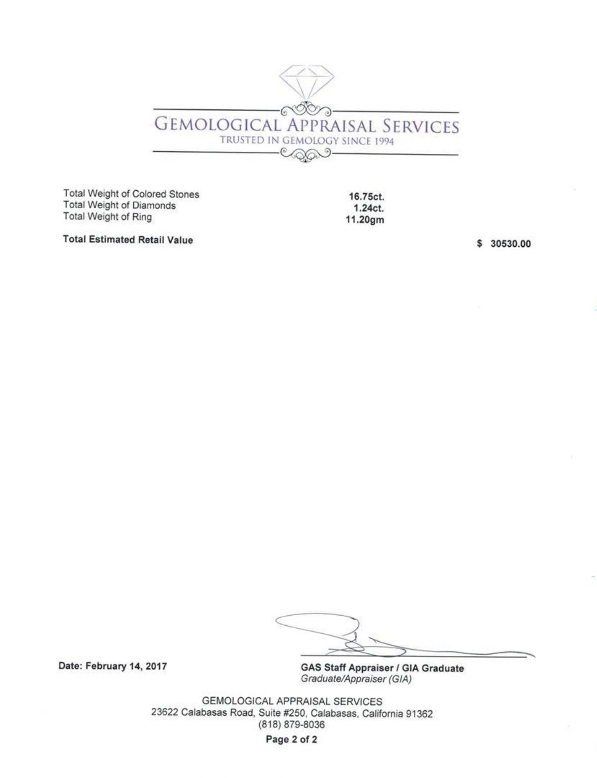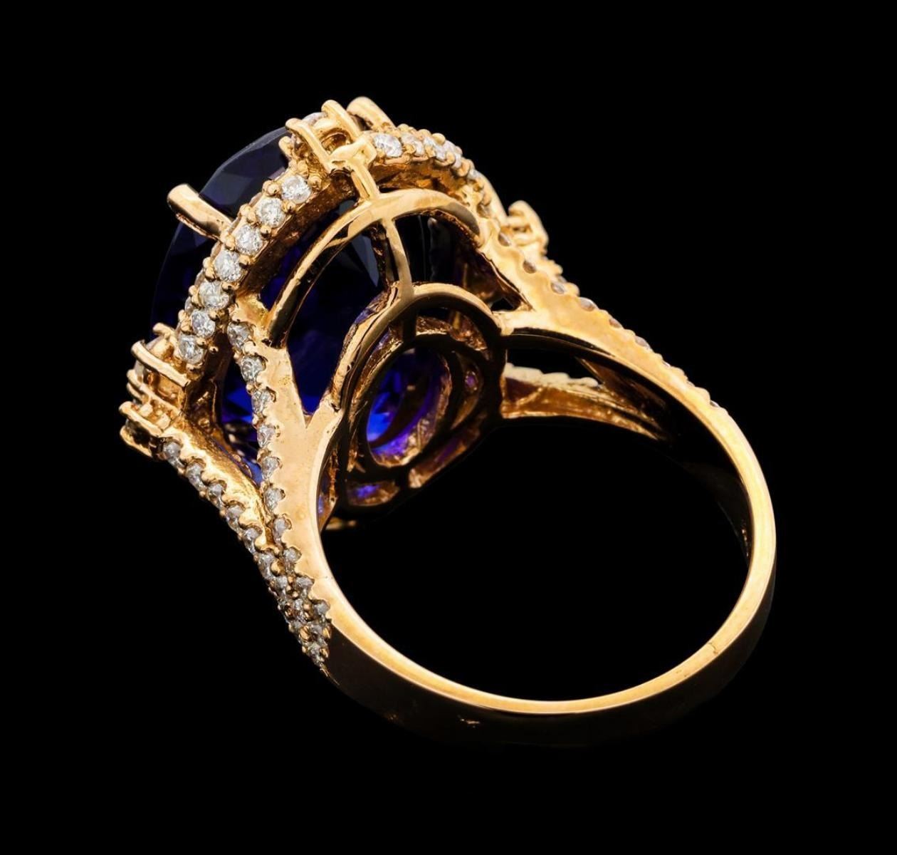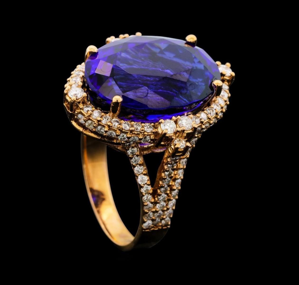 One electronically tested 14KT rose gold lady's cast fashion ring with a triple split shank basket halo with a bright polish finish. Condition is new, good workmanship. The featured lady's ring has a shank measuring 2.95 millimeters wide. identi?ed with markings of "K14". Containing: One prong set oval modified brilliant cut natural tanzanite, measuring 17.76 x 12.75 x 10.08mm, (depth est.) 4% bulge factor, approximate weight of 16.75ct., clarity is eye clean, dark, strong, bluish violet color, (GIA bV 7/5), cut is very good. Transmitting light with no distortion, transparent. Colored gemstones are presumed to have been subjected to commonly used enhancement processes. Graded loose prior to setting in the GIA Laboratory, Report #2151952122. Six prong set round brilliant out diamonds, measuring 2.10 - 2.00 x 1.27mm (depth est.) approximate total weight of 6 Stones = 0.20ct Graded in the setting. Clarity SI-2 to I-1 Color H - I Cut Good Two prong set round brilliant cut diamonds, measuring 1.60 - 1.50 x 0.96mm (depth est.) approximate total weight of 2 Stones = 0.03ct. Graded in the setting, Graded in the setting. Clarlty SI-2 to l-1 Color H - I Cut Good. One hundred fourteen prong set round brilliant cut diamonds, measuring 1.40 - 1.30 x 0.81mm (depth est.) approximate total weight of 114 Stones = 1.01ct. Graded in the setting. Clarity SI-2 to I-1 Color G - I Cut Good Total Weight of Colored Stones 16.75ct. Total Weight of Diamonds 1.24ct. Total Weight of Ring 11.20 gm Total Retail Replacement Value $ 30,530.00 GAS Appraised.
