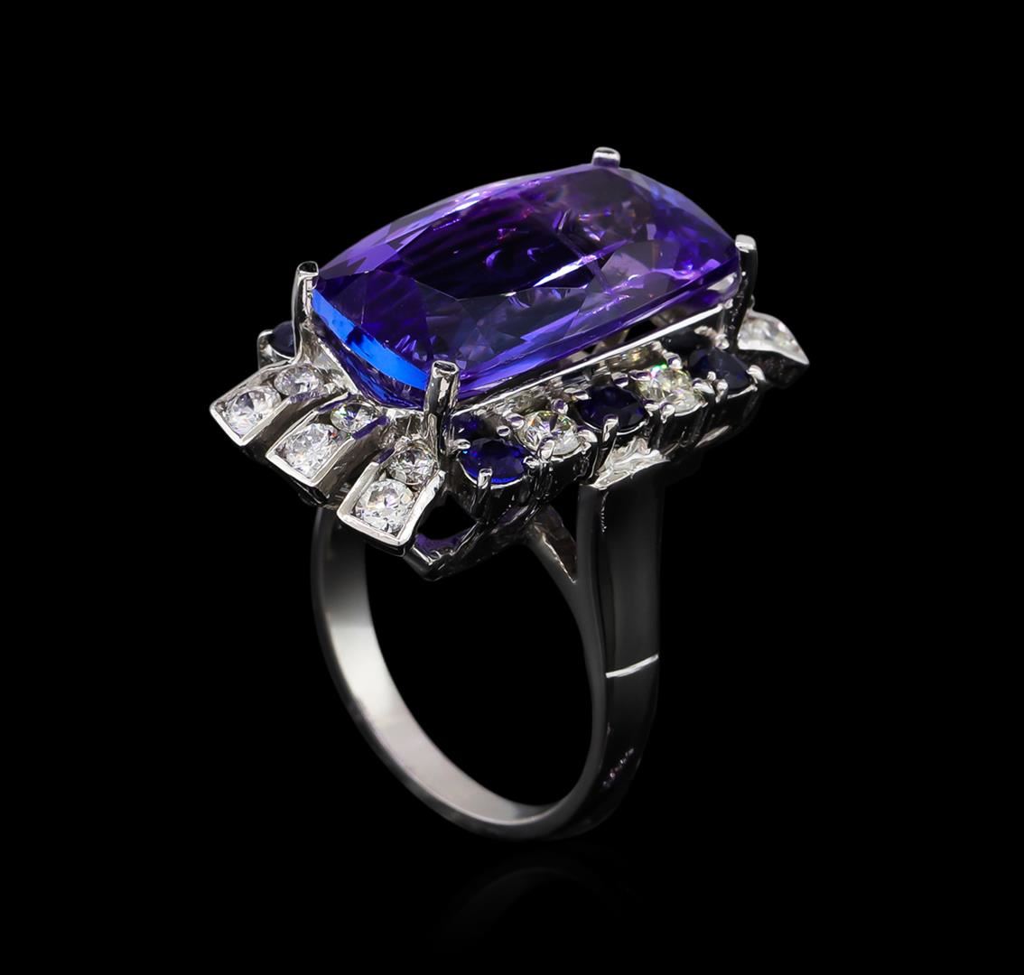 One electronically tested 14KT white gold ladies cast tanzanite, sapphire and diamond ring with a bright polish finish. The featured tanzanite is set within a stylized sapphire and diamond bezel supported by tapering shoulders, completed by a two millimeter wide band. Identified with markings of "K14". Condition is new, good workmanship. Containing: One prong set rectangular cushion mixed cut natural tanzanite, measuring 19.80 x 11.80 x 8.10mm, approximate weight of 16.83ct., clarity is eye clean, type I, medium dark, moderately strong, bluish violet color, (GIA bV 6/4), cut is good. Transmitting light with no distortion, transparent. Colored Stone Grading Report attached. Graded in the setting. Tanzanite is a very rare gemstone that is only found in the country of Tanzania. Originally discovered in 1967. Tiffany & Company, named the stone Tanzanite. It is found in the Usumburu Mountains that border the Umba Valley of northern Tanzania. Tanzanite occurs in gray, brown, violet, blue, reddish-purple, & green. The gem is interesting because of its exceptional pleochroism. Rotated in different directions a tanzanite will exhibit multiple changes of color. Tanzanite has a low tolerance to ultrasonic cleaning, and should not be cleaned using this method. Six prong set round mixed cut natural blue sapphires approximate total weight of 0.85ct., clarity is eye clean, type II, dark, moderately strong, blue color, (GIA B 7/4), cut is good. Transmitting light with no distortion, transparent. Indications of laboratory high temperature diffusion treatment. Color grade is an average for the group. Graded in the setting. Sixteen prong & channel set round brilliant cut diamonds approximate total weight of 16 Stones = 1.14ct. Graded in the setting. Clarity: SI-1 to I-1. Color: E - F. Total Weight of Colored Stones 17.68ct. Total Weight of Diamonds 1.14ct. Total Weight of Ring 12.66gm. AIG Appraised at $44,785.00.