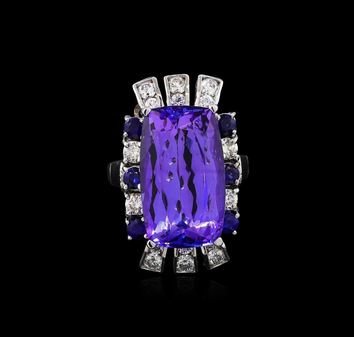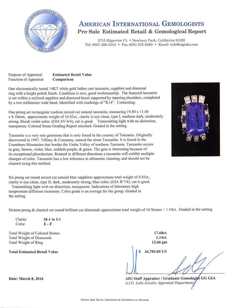 One electronically tested 14KT white gold ladies cast tanzanite, sapphire and diamond ring with a bright polish finish. The featured tanzanite is set within a stylized sapphire and diamond bezel supported by tapering shoulders, completed by a two millimeter wide band. Identified with markings of "K14". Condition is new, good workmanship. Containing: One prong set rectangular cushion mixed cut natural tanzanite, measuring 19.80 x 11.80 x 8.10mm, approximate weight of 16.83ct., clarity is eye clean, type I, medium dark, moderately strong, bluish violet color, (GIA bV 6/4), cut is good. Transmitting light with no distortion, transparent. Colored Stone Grading Report attached. Graded in the setting. Tanzanite is a very rare gemstone that is only found in the country of Tanzania. Originally discovered in 1967. Tiffany & Company, named the stone Tanzanite. It is found in the Usumburu Mountains that border the Umba Valley of northern Tanzania. Tanzanite occurs in gray, brown, violet, blue, reddish-purple, & green. The gem is interesting because of its exceptional pleochroism. Rotated in different directions a tanzanite will exhibit multiple changes of color. Tanzanite has a low tolerance to ultrasonic cleaning, and should not be cleaned using this method. Six prong set round mixed cut natural blue sapphires approximate total weight of 0.85ct., clarity is eye clean, type II, dark, moderately strong, blue color, (GIA B 7/4), cut is good. Transmitting light with no distortion, transparent. Indications of laboratory high temperature diffusion treatment. Color grade is an average for the group. Graded in the setting. Sixteen prong & channel set round brilliant cut diamonds approximate total weight of 16 Stones = 1.14ct. Graded in the setting. Clarity: SI-1 to I-1. Color: E - F. Total Weight of Colored Stones 17.68ct. Total Weight of Diamonds 1.14ct. Total Weight of Ring 12.66gm. AIG Appraised.