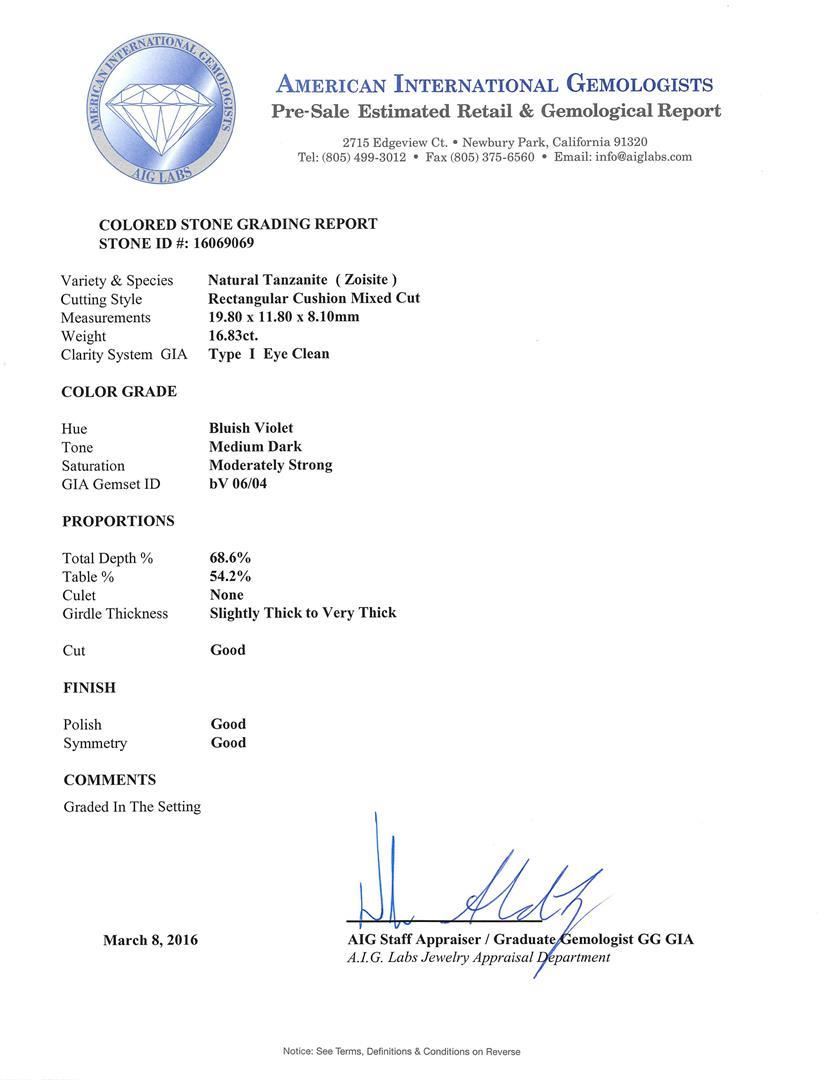 One electronically tested 14KT white gold ladies cast tanzanite, sapphire and diamond ring with a bright polish finish. The featured tanzanite is set within a stylized sapphire and diamond bezel supported by tapering shoulders, completed by a two millimeter wide band. Identified with markings of "K14". Condition is new, good workmanship. Containing: One prong set rectangular cushion mixed cut natural tanzanite, measuring 19.80 x 11.80 x 8.10mm, approximate weight of 16.83ct., clarity is eye clean, type I, medium dark, moderately strong, bluish violet color, (GIA bV 6/4), cut is good. Transmitting light with no distortion, transparent. Colored Stone Grading Report attached. Graded in the setting. Tanzanite is a very rare gemstone that is only found in the country of Tanzania. Originally discovered in 1967. Tiffany & Company, named the stone Tanzanite. It is found in the Usumburu Mountains that border the Umba Valley of northern Tanzania. Tanzanite occurs in gray, brown, violet, blue, reddish-purple, & green. The gem is interesting because of its exceptional pleochroism. Rotated in different directions a tanzanite will exhibit multiple changes of color. Tanzanite has a low tolerance to ultrasonic cleaning, and should not be cleaned using this method. Six prong set round mixed cut natural blue sapphires approximate total weight of 0.85ct., clarity is eye clean, type II, dark, moderately strong, blue color, (GIA B 7/4), cut is good. Transmitting light with no distortion, transparent. Indications of laboratory high temperature diffusion treatment. Color grade is an average for the group. Graded in the setting. Sixteen prong & channel set round brilliant cut diamonds approximate total weight of 16 Stones = 1.14ct. Graded in the setting. Clarity: SI-1 to I-1. Color: E - F. Total Weight of Colored Stones 17.68ct. Total Weight of Diamonds 1.14ct. Total Weight of Ring 12.66gm. AIG Appraised.