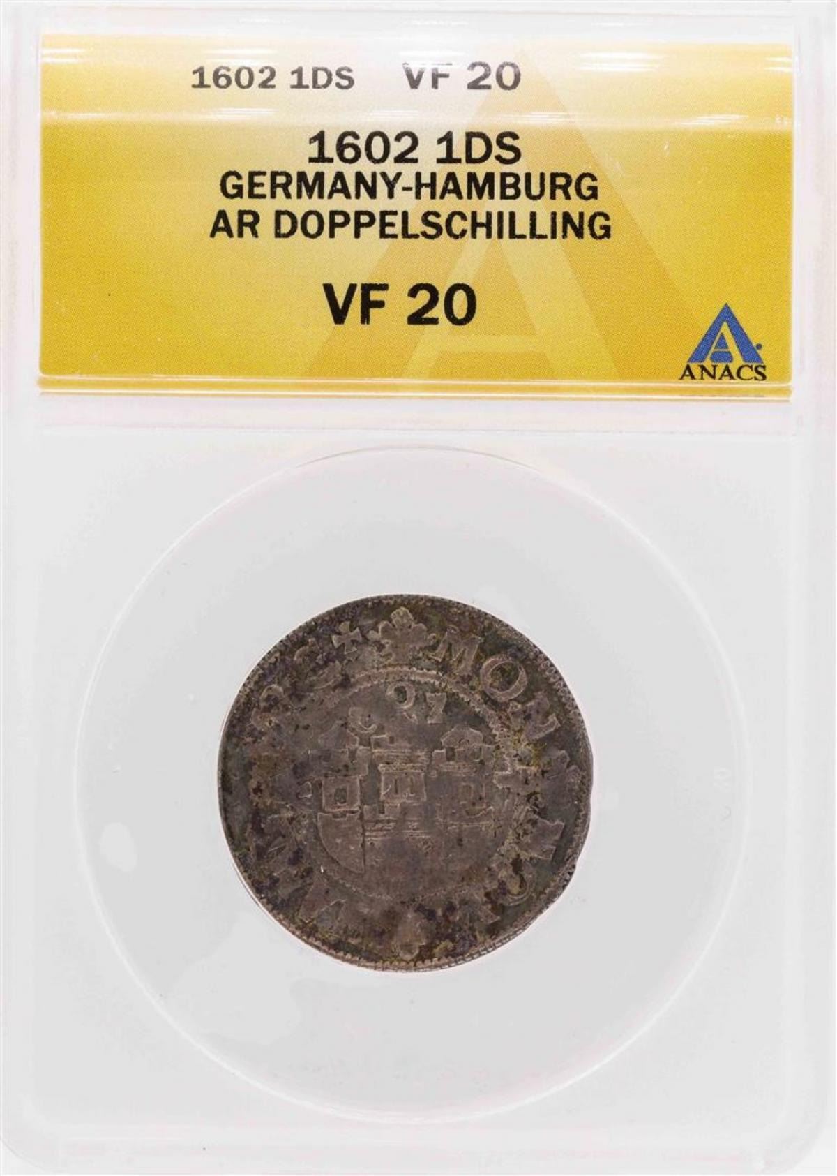 One 1602 Germany-Hamburg AR Doppelschilling Coin ANACS VF20. ANACS Appraised.