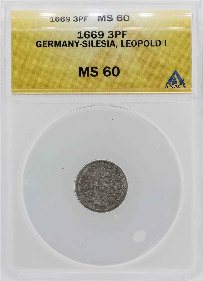 One 1669 Germany-Silesia Leopold 3 Pfennig Coin ANACS MS60. ANACS Appraised.