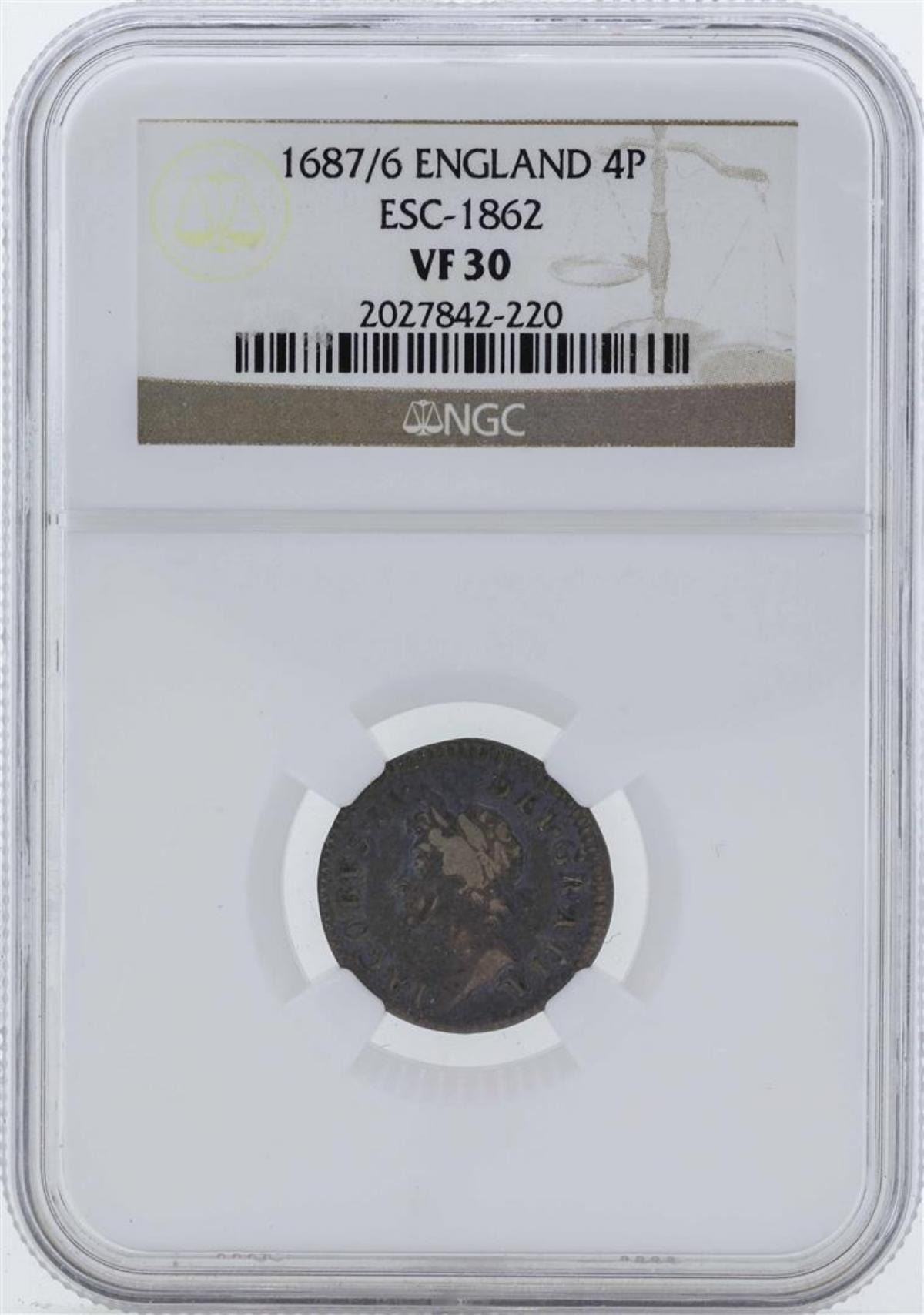 One 1687/6 England NGC30. NGC Certified.