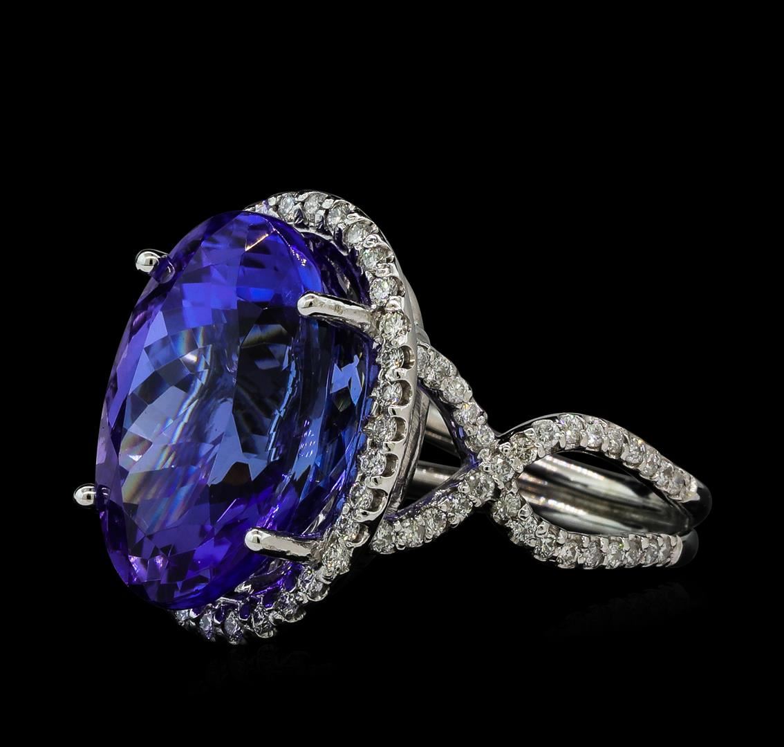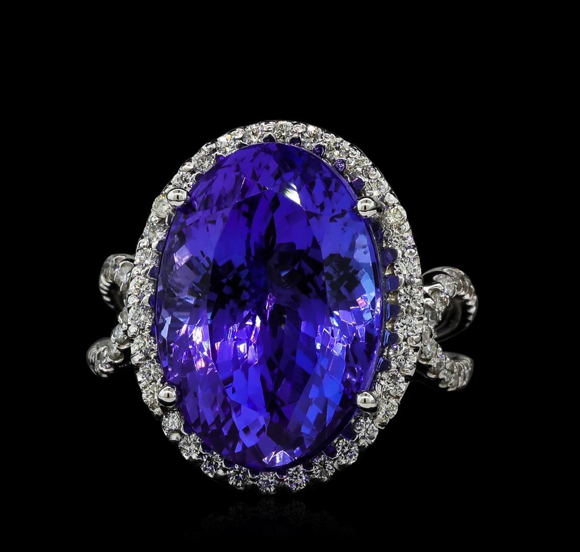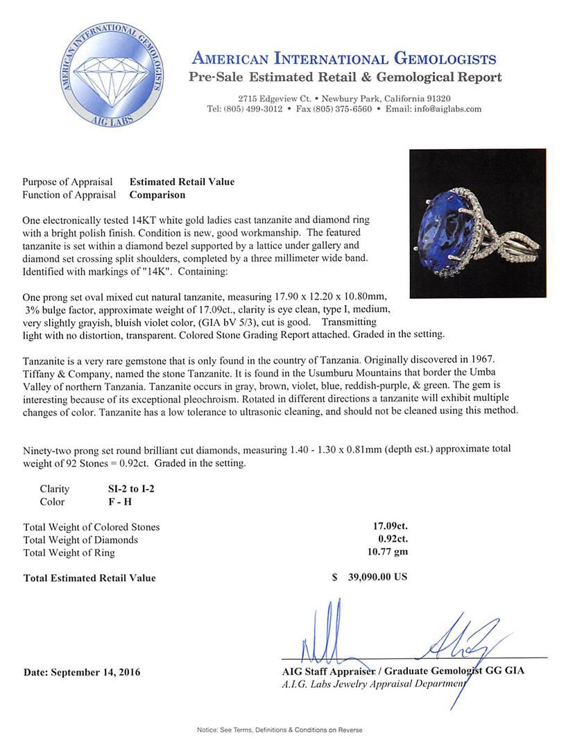 One electronically tested 14KT white gold ladies cast tanzanite and diamond ring with a bright polish finish. The featured tanzanite is set within a diamond bezel supported by a lattice under gallery and diamond set crossing split shoulders, completed by a three millimeter wide band. Identified with markings of '14K'. Condition is new, good workmanship. Containing: One prong set oval mixed cut natural tanzanite, measuring 17.90 x 12.20 x 10.80mm, 3%. bulge factor, approximate weight of 17.09ct., clarity is eye clean, type I, medium, very slightly grayish, bluish violet color, (GIA bV 5/3), cut is good. Transmitting light with no distortion, transparent. Colored Stone Grading Report attached. Graded in the setting. Tanzanite is a very rare gemstone that is only found in the country of Tanzania. Originally discovered in 1967. Tiffany & Company, named the stone Tanzanite. It is found in the Usumburu Mountains that border the Umba Valley of northern Tanzania. Tanzanite occurs in gray, brown, violet, blue, reddish-purple, & green. The gem is interesting because of its exceptional pleochroism. Rotated in different directions a tanzanite will exhibit multiple changes of color. Tanzanite has a low tolerance to ultrasonic cleaning, and should not be cleaned using this method. Ninety-Two prong set round brilliant cut diamonds, measuring 1.40 - 1.30 x 0.81mm (depth est.) approximate total weight of 92 Stones = 0.92ct. Graded in the setting. Clarity SI-2 to I-2. Color: F - H. Total Weight of Colored Stones 17.09ct.. Total Weight of Diamonds 0.92ct.. Total Weight of Ring 10.77gm. AIG Appraised at $39,090.00.