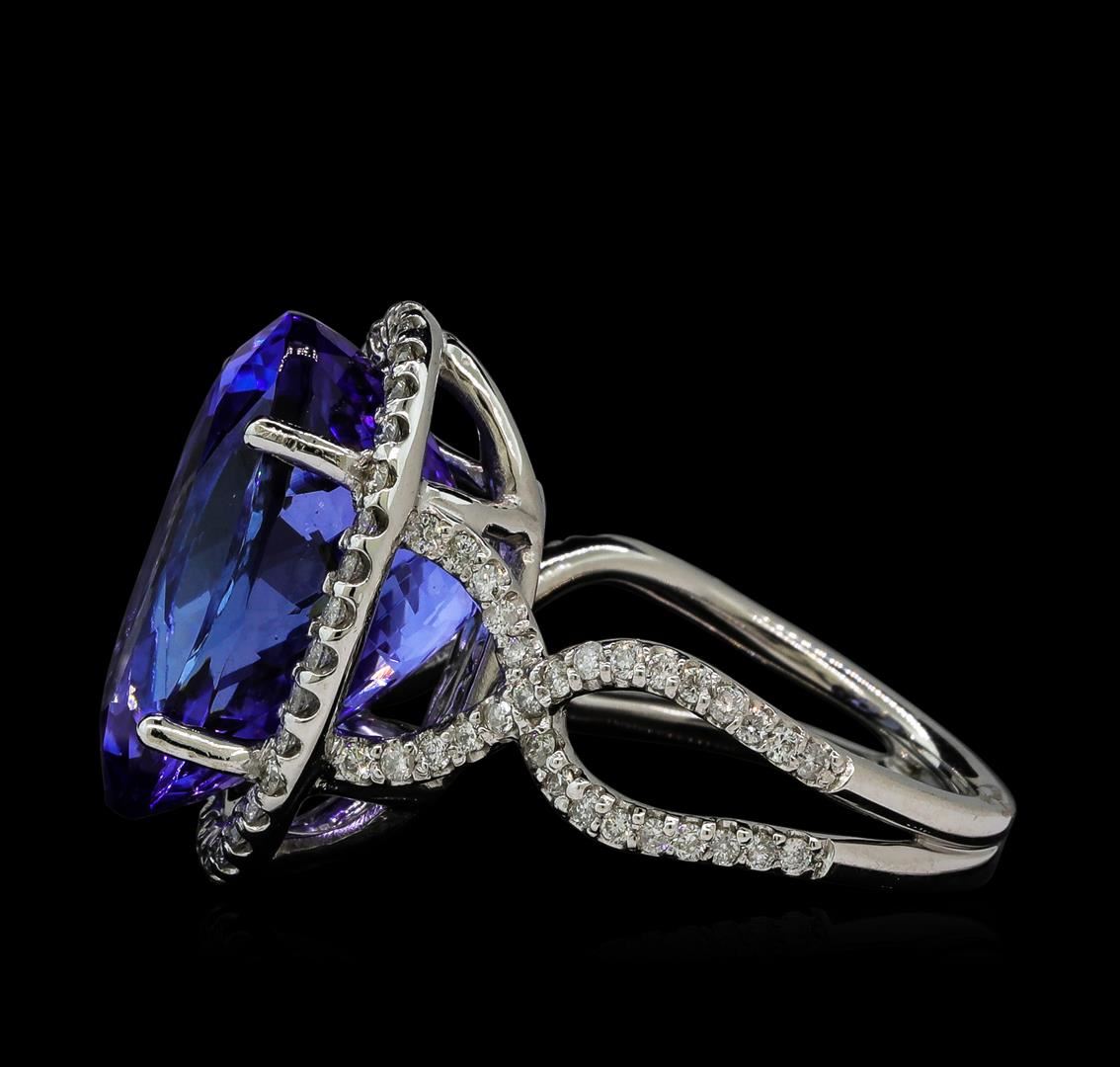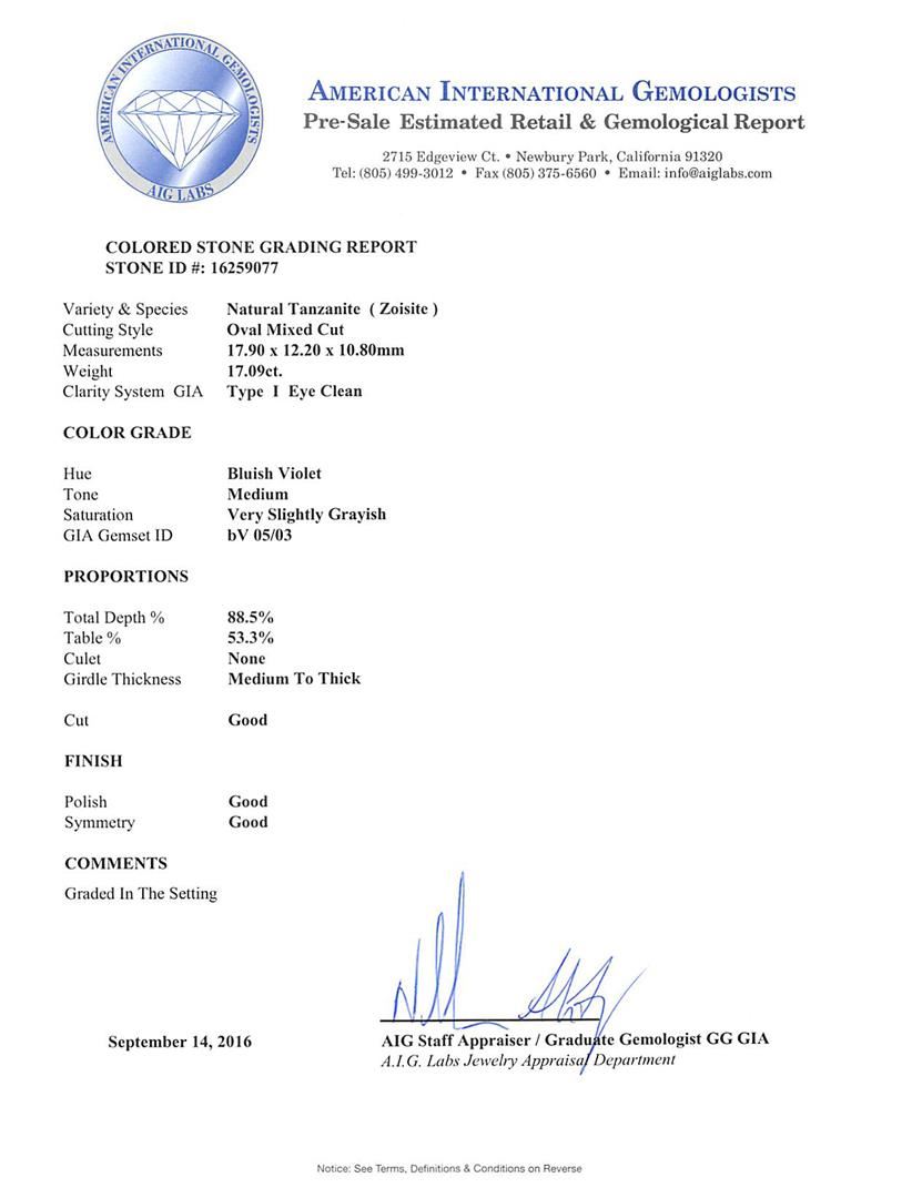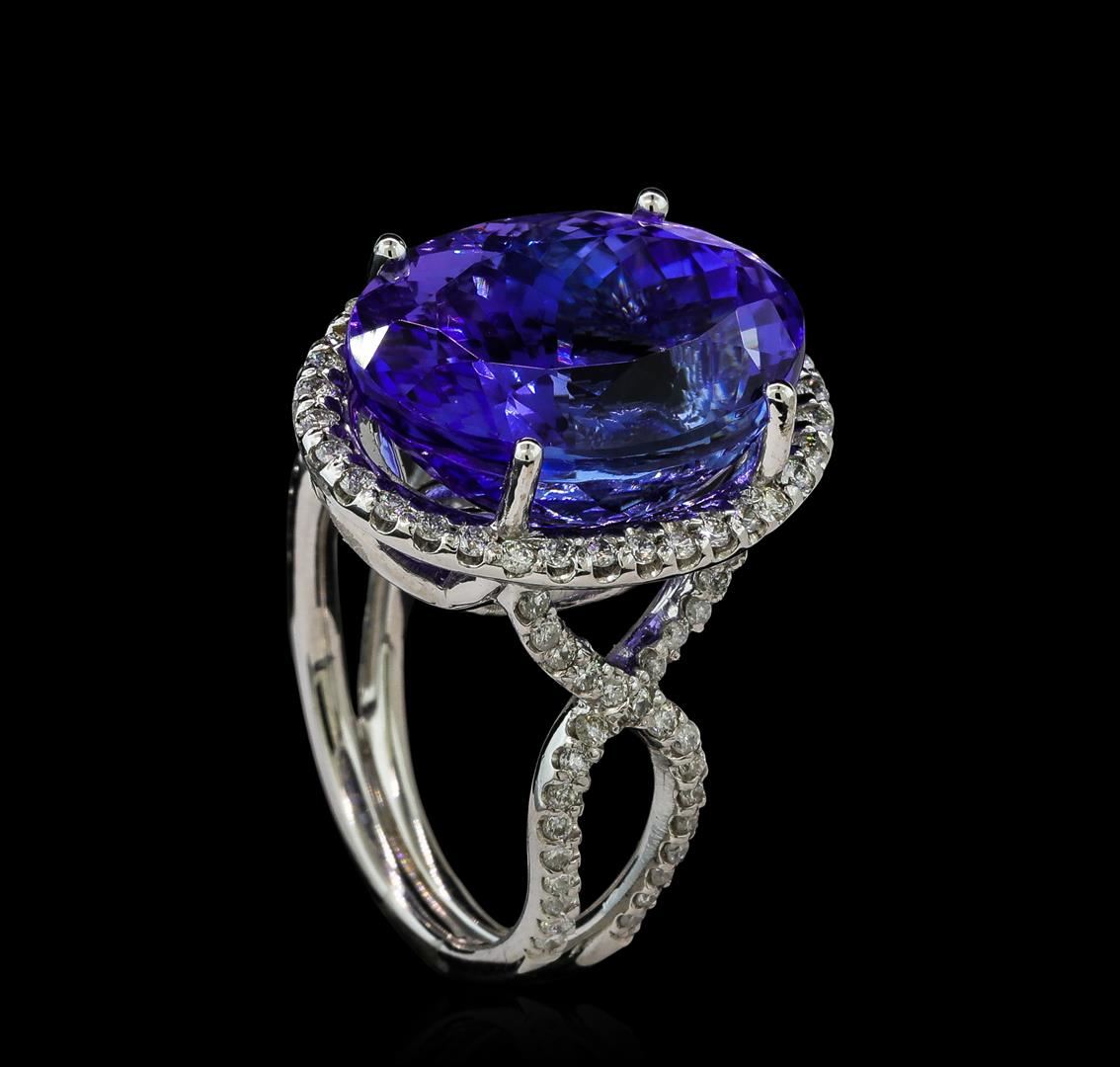 One electronically tested 14KT white gold ladies cast tanzanite and diamond ring with a bright polish finish. The featured tanzanite is set within a diamond bezel supported by a lattice under gallery and diamond set crossing split shoulders, completed by a three millimeter wide band. Identified with markings of '14K'. Condition is new, good workmanship. Containing: One prong set oval mixed cut natural tanzanite, measuring 17.90 x 12.20 x 10.80mm, 3%. bulge factor, approximate weight of 17.09ct., clarity is eye clean, type I, medium, very slightly grayish, bluish violet color, (GIA bV 5/3), cut is good. Transmitting light with no distortion, transparent. Colored Stone Grading Report attached. Graded in the setting. Tanzanite is a very rare gemstone that is only found in the country of Tanzania. Originally discovered in 1967. Tiffany & Company, named the stone Tanzanite. It is found in the Usumburu Mountains that border the Umba Valley of northern Tanzania. Tanzanite occurs in gray, brown, violet, blue, reddish-purple, & green. The gem is interesting because of its exceptional pleochroism. Rotated in different directions a tanzanite will exhibit multiple changes of color. Tanzanite has a low tolerance to ultrasonic cleaning, and should not be cleaned using this method. Ninety-Two prong set round brilliant cut diamonds, measuring 1.40 - 1.30 x 0.81mm (depth est.) approximate total weight of 92 Stones = 0.92ct. Graded in the setting. Clarity SI-2 to I-2. Color: F - H. Total Weight of Colored Stones 17.09ct.. Total Weight of Diamonds 0.92ct.. Total Weight of Ring 10.77gm. AIG Appraised at $39,090.00.