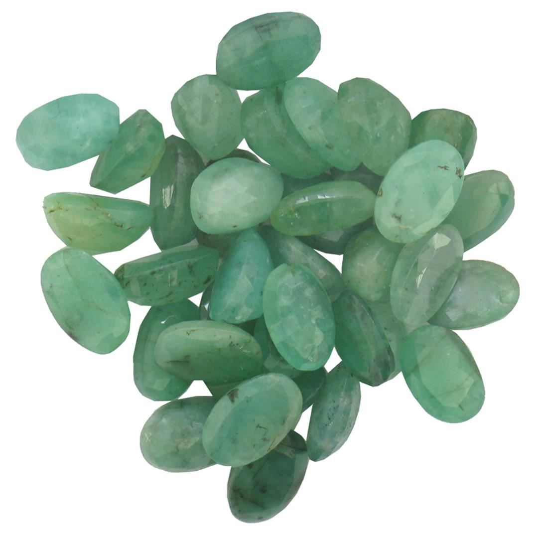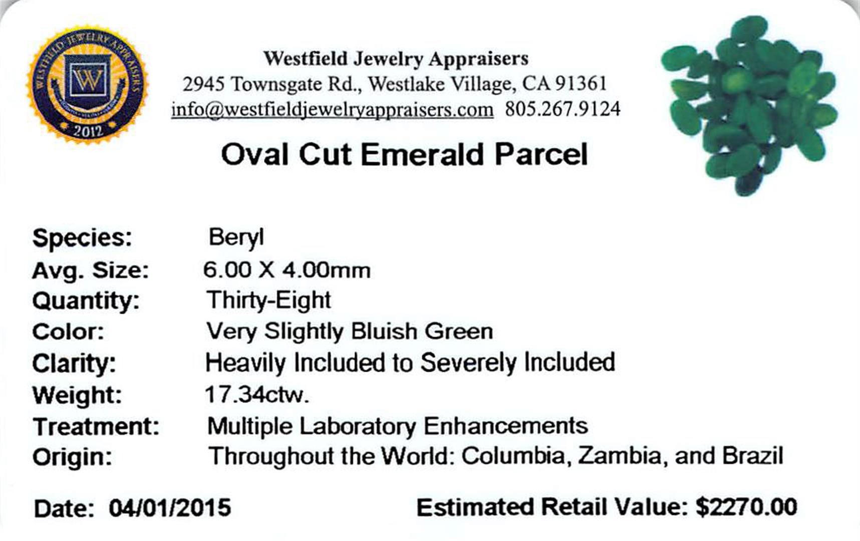 Thirty-eight oval mixed cut natural emeralds exact total weight 17.34ct., clarity is heavily included, medium dark, very slightly grayish, very slightly greenish blue color, (GIA vslgB 6/3), cut is good. Westfield Appraised.