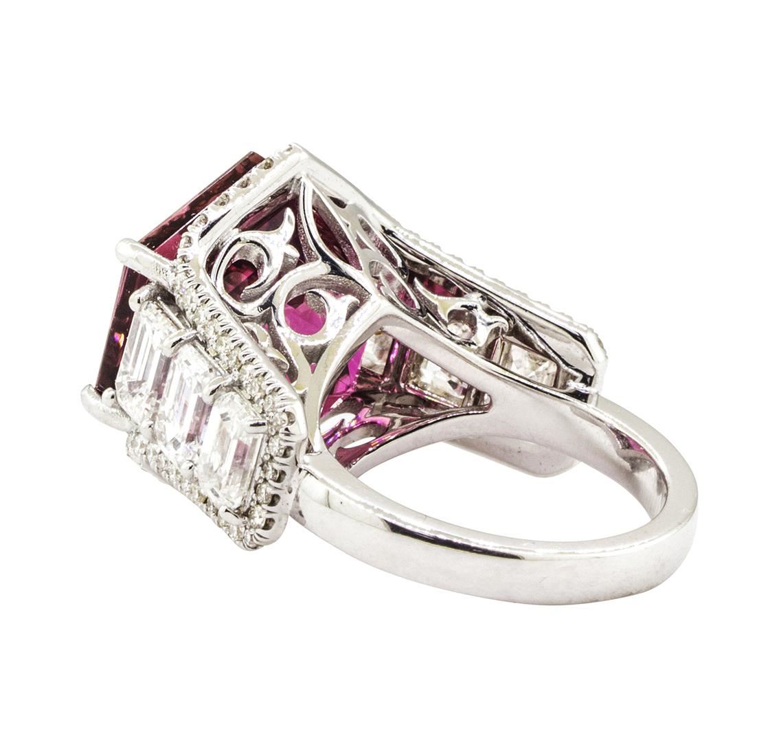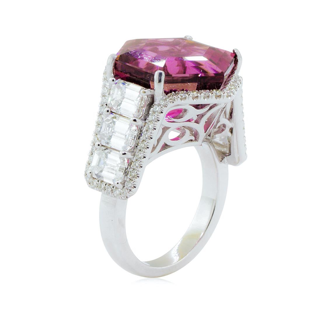One electronically tested 18KT white gold lady's custom CAD/CAM fashion ring with a octagonal cathedral halo with a bright polish finish. Condition is new, good workmanship. The featured lady's ring has a shank measuring 2.75 millimeters wide. Identified with markings of "18K". Containing:One prong set hexagonal modified step cut natural rubellite, measuring15.60 x 13.50 x 10.30mm, (depth est.) approximate weight of 13.40ct., clarity is eye clean, medium, very slightly brownish, slightly purplish red color, (GIA slpR 5/3), cut is very good. Transmitting light withno distortion, transparent. Colored gemstones are presumed to have been subjected to commonly used enhancement processes. Graded in the setting.Six prong set emerald cut diamonds, measuring 5.30 x 3.90 x 2.73mm (depth est.) approximate total weight of 6 Stones = 3.16ct. Gradedin the setting. Color Clarity Cut H - IVS-2 to 51-1Very Good Seventy-four prong set round brilliant cut diamonds, measuring 1.45 - 1.35 x 0.87mm (depth est.) approximate total weight of 74 Stones = 0.85ct. Graded in the setting. Color Clarity Cut H - IVS-2 to SI-1Very Good Total Weight of Colored Stones Total Weight of Diamonds Total Weight of RingTotal Estimated Retail Value 13.40ct.4.01ct.11.80gm $ 19705.00