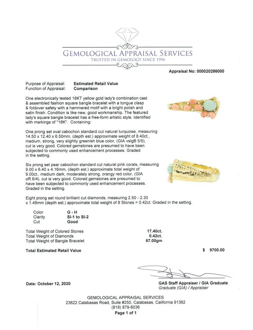 One electronically tested 18KT yellow gold lady's combination cast & assembled fashion square bangle bracelet with a tongue clasp & foldover safety with a hammered motif with a bright polish and satin finish. The featured lady's square bangle bracelet has a free-form artistic style. Identified with markings of '18K'. Condition is like new, good workmanship. Containing: One prong set oval cabochon standard cut natural turquoise, measuring 14.50 x 12.40 x 6.50mm, (depth est.) approximate weight of 8.40ct., medium, strong, very slightly greenish blue color, (GIA vslgB 5/5), cut is very good. Colored gemstones are presumed to have been subjected to commonly used enhancement processes. Graded in the setting. Six prong set pear cabochon standard cut natural pink corals, measuring 9.00 x 6.40 x 4.16mm, (depth est.) approximate total weight of 9.00ct., medium dark, moderately strong, orangy red color, (GIA oR 6/4), cut is very good. Colored gemstones are presumed to have been subjected to commonly used enhancement processes. Graded in the setting. Eight prong set round brilliant cut diamonds, measuring 2.50 - 2.30 x 1.49mm (depth est.) approximate total weight of 8 Stones = 0.42ct. Graded in the setting. Color G - H Clarity SI-1 to SI-2 Cut Good. Total Weight of Colored Stones 17.40ct.. Total Weight of Diamonds 0.42ct.. Total Weight of Bangle Bracelet 67.00gm GAS Appraised at $9700.00. GAS Appraised.