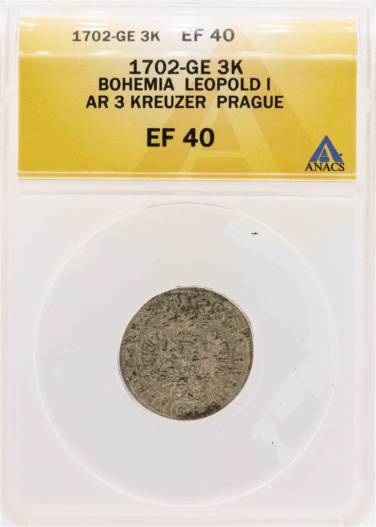One 1702-GE Bohemia Leopold I AR 3 Kreuzer Prague Coin ANACS XF40. ANACS Appraised.