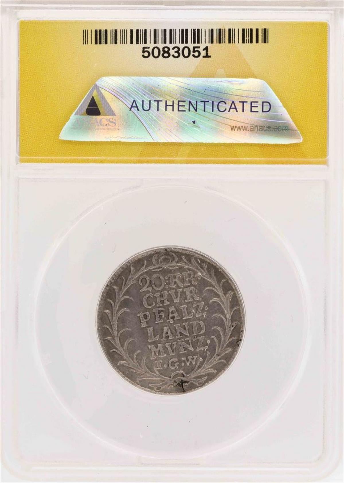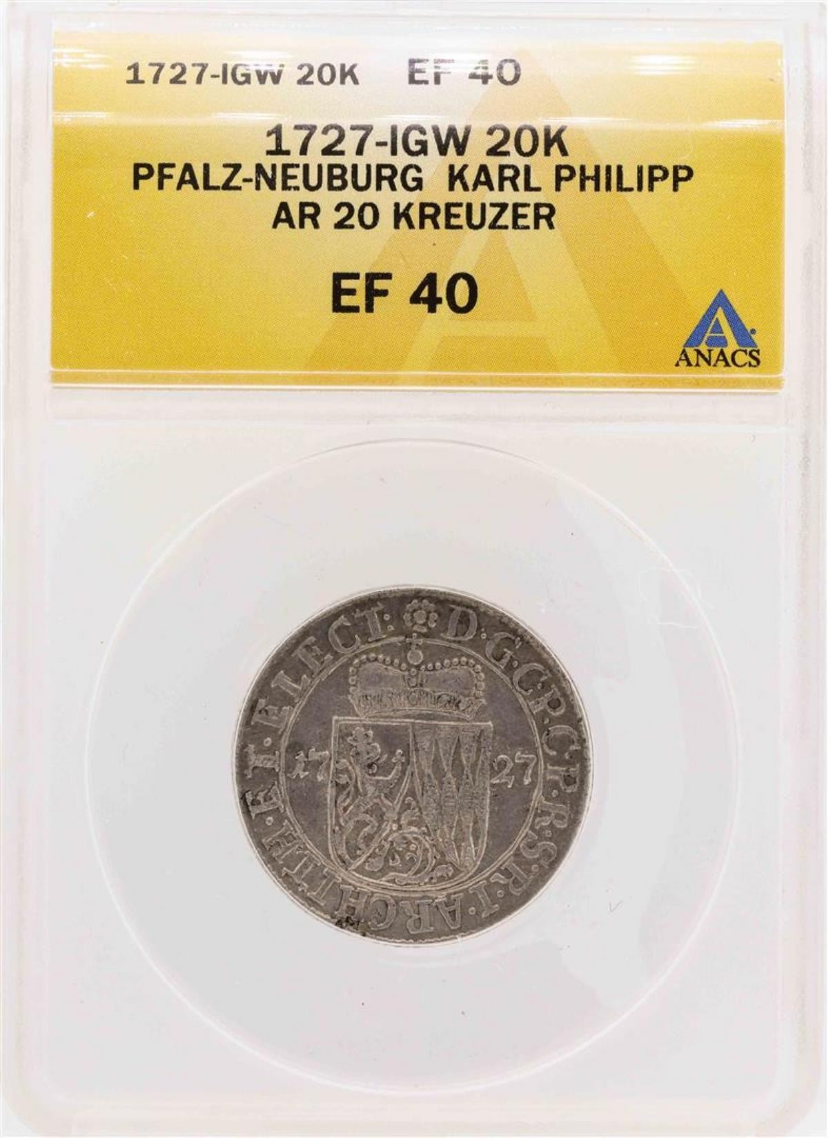 One 1727-IGW Pfalz-Neuburg Karl Philipp AR 20 Kreuzer Coin ANACS XF40. ANACS Appraised.