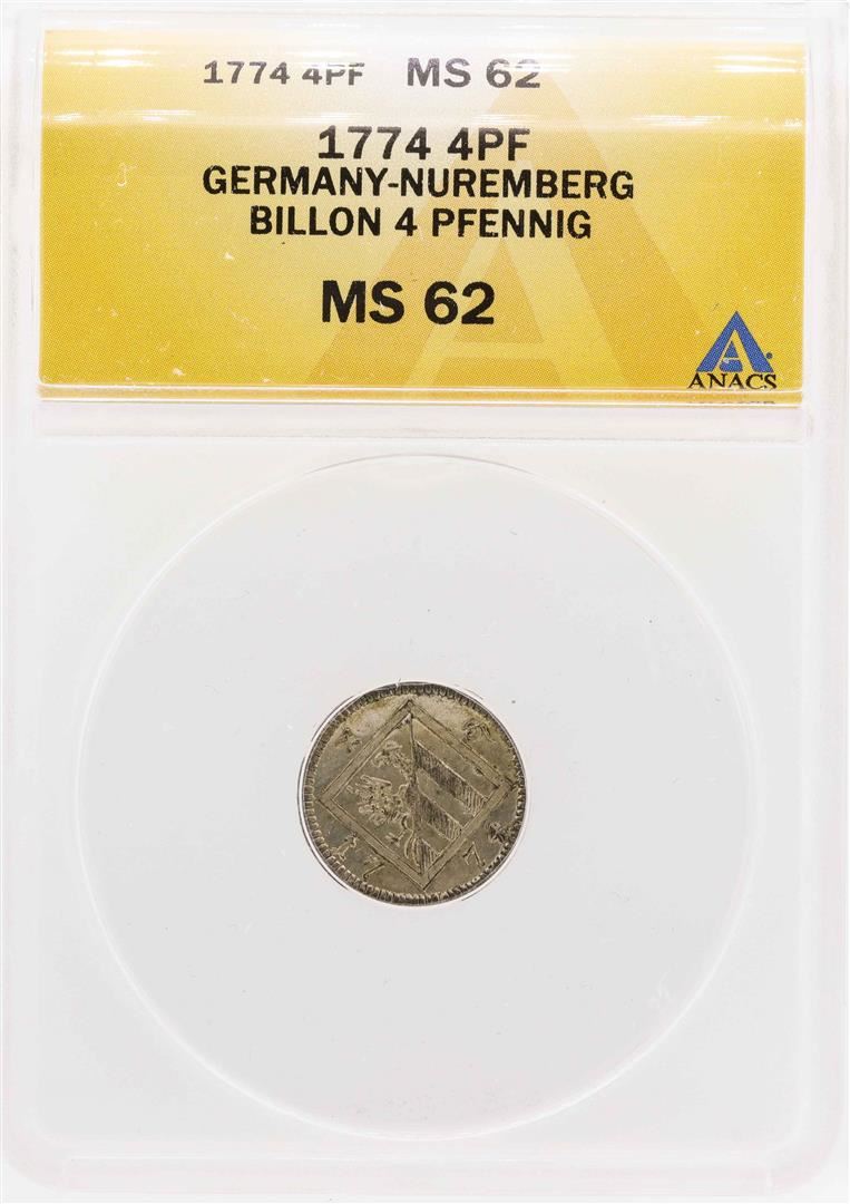 One 1774 Germany-Nuremberg Billion 4 Pfennig Coin ANACS MS62.