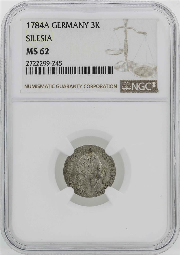 One 1784-A Germany Silesia 3 Krezuer Coin NGC MS62. NGC Certified.
