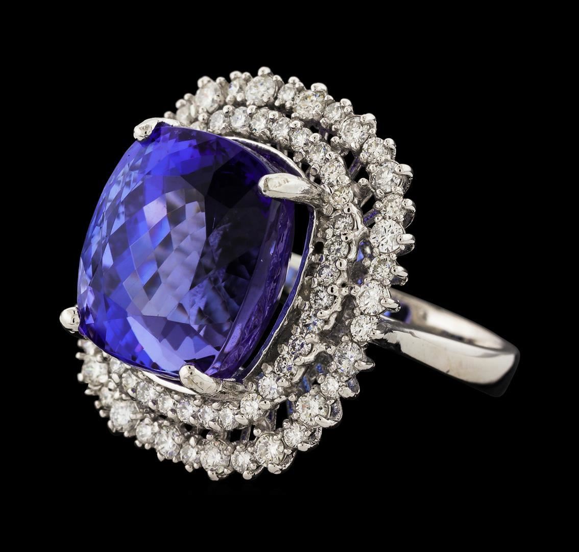 One electronically tested 14KT white gold lady's cast fashion ring with a staggered double basket halo with a bright polish finish. The featured lady's ring has a shank measuring 3.41 millimeters wide. Identified with markings of 'K14'. Condition is new, good workmanship. Containing: One prong set rectangular cushion modified brilliant cut natural tanzanite, measuring 14.22 x 12.27 x 11.26mm, (depth est.) 17%. bulge factor, approximate weight of 18.03ct., clarity is eye clean, medium dark, moderately strong, violetish blue color, (GIA vB 6/4), cut is good. Transmitting light with no distortion, transparent. Colored gemstones are presumed to have been subjected to commonly used enhancement processes. Graded in the setting. Eighteen prong set round brilliant cut diamonds, measuring 2.00 - 1.90 x 1.17mm (depth est.) approximate total weight of 18 Stones = 0.48ct. Graded in the setting. Clarity SI-1 to SI-2. Color: H - I Cut Good Fifty-Two prong set round brilliant cut diamonds, measuring 1.60 - 1.50 x 0.96mm (depth est.) approximate total weight of 52 Stones = 0.74ct. Graded in the setting. Clarity SI-1 to SI-2. Color: G - H Cut Good. Total Weight of Colored Stones 18.03ct.. Total Weight of Diamonds 1.22ct.. Total Weight of Ring 10.90gm. GAS Appraised.