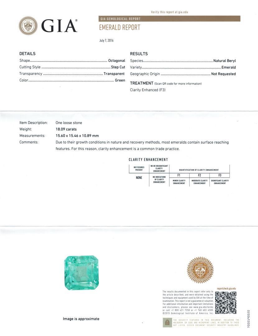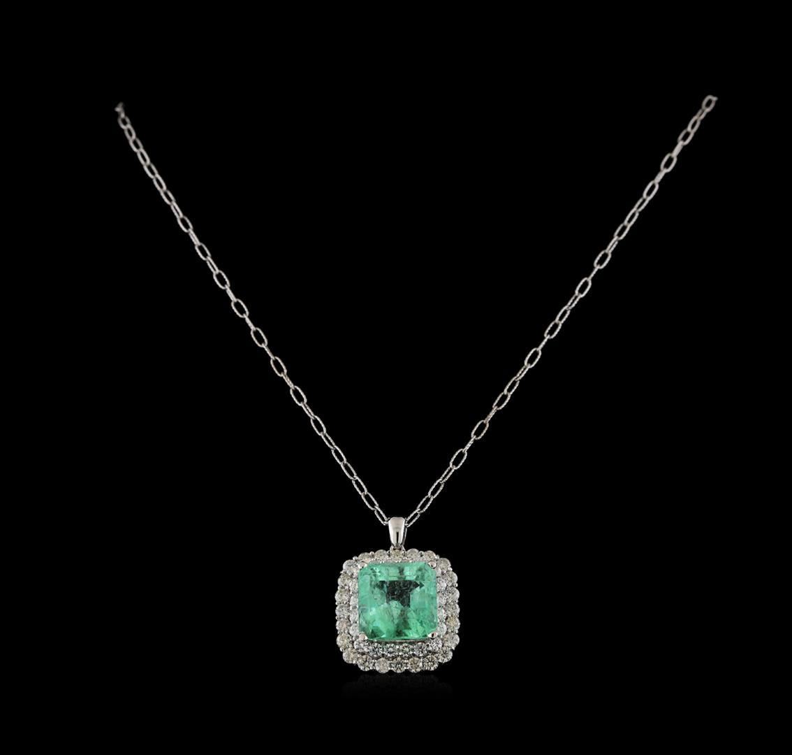 One electronically tested 14KT white gold lady's combination cast & assembled fashion pendant & chain 20.0' long, 2.5mm twisted oval cable link with a lobster claw clasp with a double basket halo with a bright polish finish. Identified with markings of '14K'. Condition is new, good workmanship. Containing: One prong set emerald standard step cut natural emerald, measuring 15.60 x 15.46 x 10.89mm, (depth est.) approximate weight of 18.09ct., clarity is moderately included, medium light, very slightly grayish, green color, (GIA G 4/3), cut is good. Transmitting light somewhat diffusely, transparent to translucent. Naturally occurring internal & external characteristics are present. Indications of oil residue. Clarity enhanced. Colored gemstones are presumed to have been subjected to commonly used enhancement processes. Graded loose prior to setting in the GIA Laboratory, Report #5171668662. Twenty-Four prong set round brilliant cut diamonds, measuring 3.10 - 3.00 x 1.86mm (depth est.) approximate total weight of 24 Stones = 2.52ct. Graded in the setting. Clarity SI-1 to SI-2. Color: I - J Cut Good Twenty prong set round brilliant cut diamonds, measuring 2.80 - 2.70 x 1.71mm (depth est.) approximate total weight of 20 Stones = 1.57ct. Graded in the setting. Clarity SI-1 to SI-2. Color: H - I Cut Good. Total Weight of Colored Stones 18.09ct.. Total Weight of Diamonds 4.09ct.. Total Weight of Pendant & Chain 18.40gm GAS Appraised.