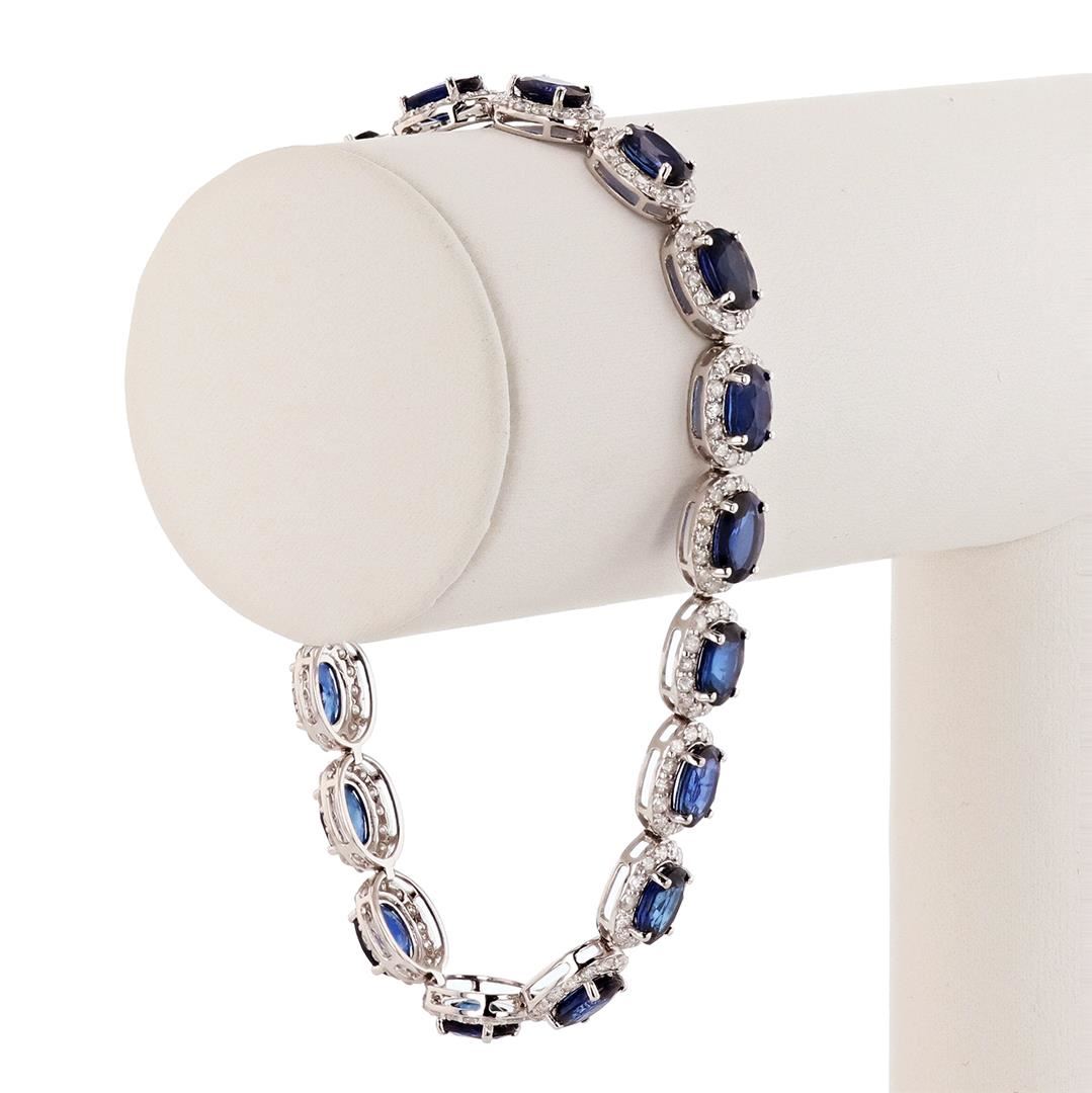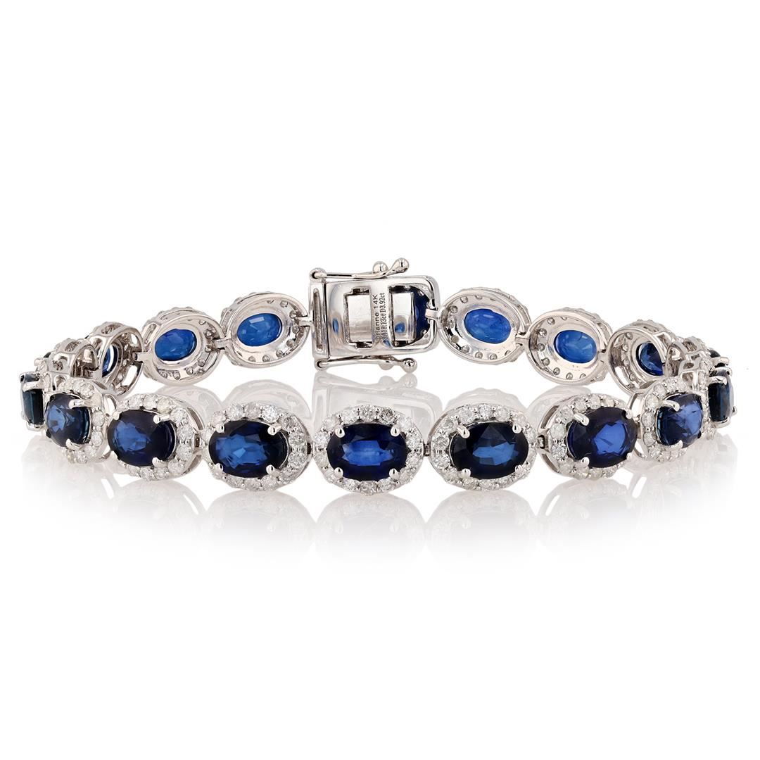 ONE 14K WHITE GOLD LADY'S CUSTOM DIAMOND AND BLUE SAPPHIRE BRACELET. 16.80 GR TW. 7.5" LONG. CONTAINING 1- MAIN CENTERSTONE(S): IDENTITY: 18 COUNTS NATURAL SAPPHIRE SET IN 4 PRONGS SETTING. CARAT WEIGHT: 18.13 CTS. 18 COUNTS. SHAPE AND MEASUREMEMT: OVAL CUT. FROM APPROX 7 X 5 MM. QUALITY: "DIFFUSED" QUALITY BLUE SAPPHIRE, FINE CUT AND CLARITY. PERMANENT TREATEMENT 2- ADJACENT GEMSTONES IDENTITY: NATURAL DIAMONDS. SHAPE: ROUND BRILLIANT CUT. CARAT WEIGHT: 3.92 CTS. QUALITY: G-H COLOR, I CLARITY. ALL FINE CUTTING AND PROPORTIONS. ALL PRONGS SETTINGS STYLE TOTAL GEMSTONES WEIGHT: 22.05 CTS TW.