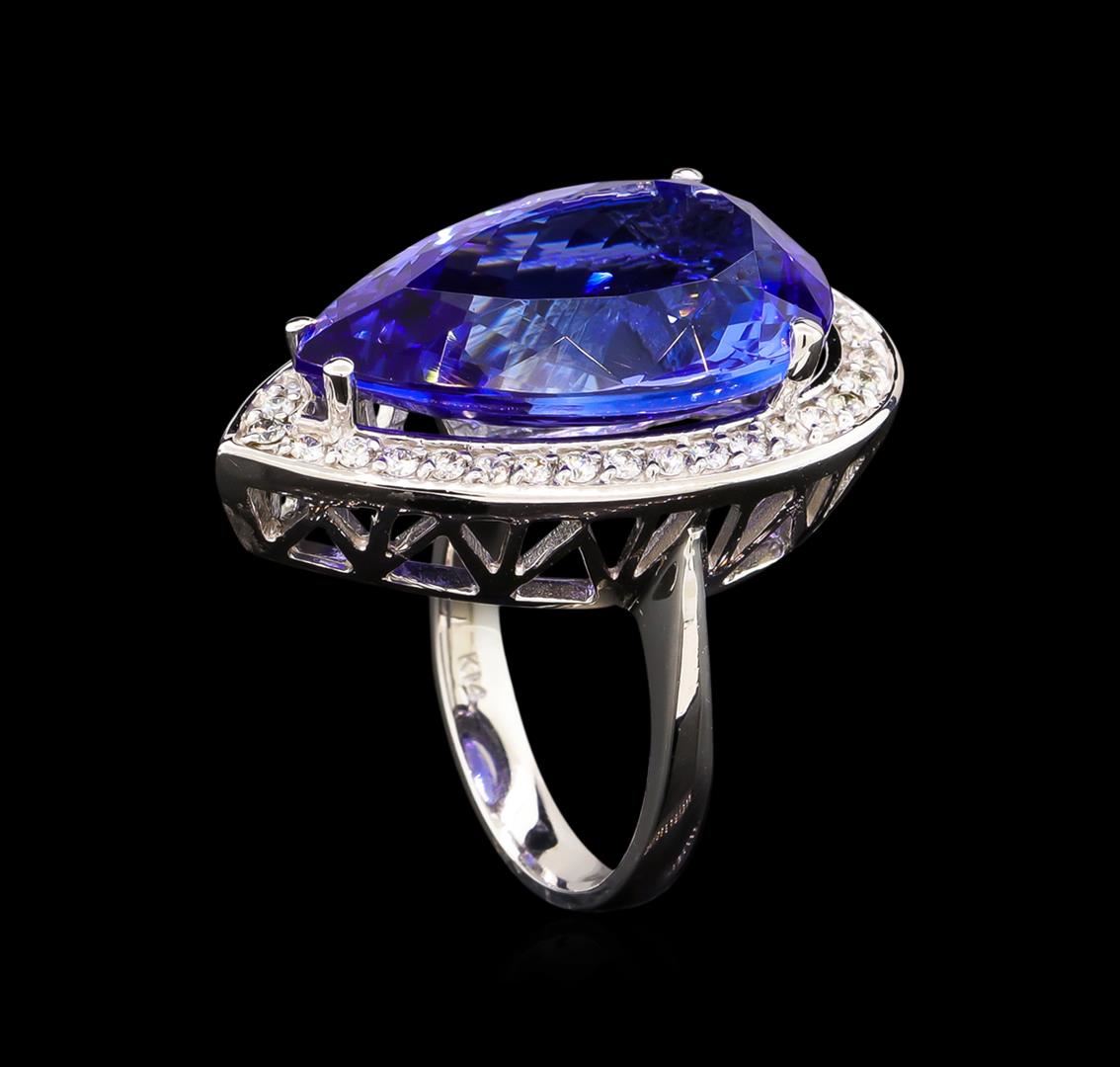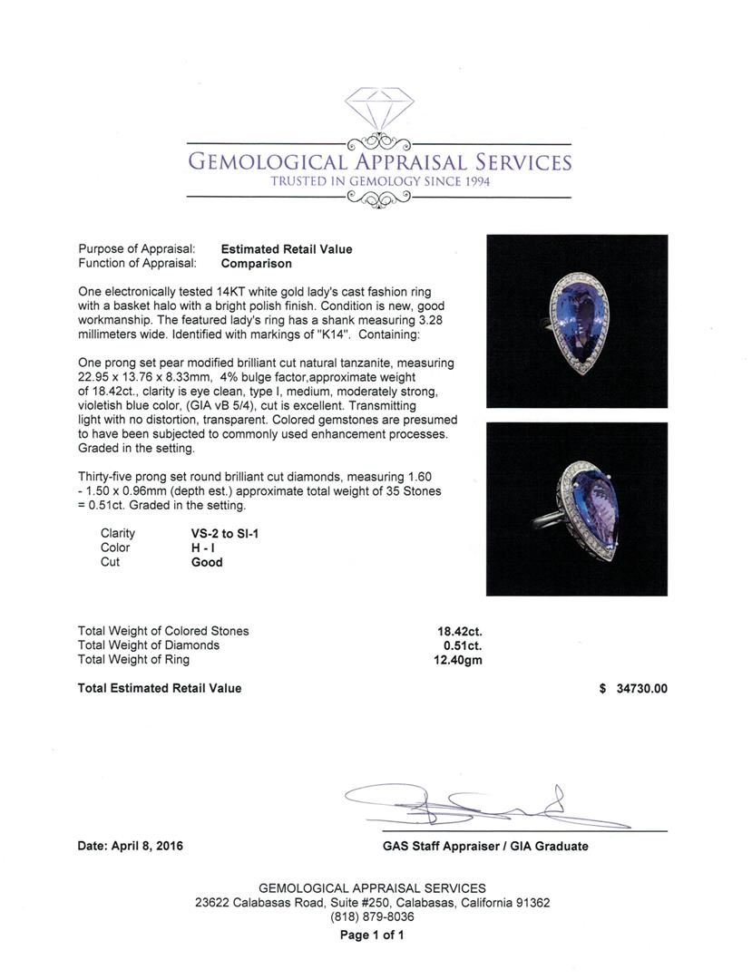 One electronically tested 14KT white gold lady's cast fashion ring with a basket halo with a bright polish finish. The featured lady's ring has a shank measuring 3.28 millimeters wide. Identified with markings of "K14". Condition is new, good workmanship. Containing: One prong set pear modified brilliant cut natural tanzanite, measuring 22.95 x 13.76 x 8.33mm, 4%. bulge factor, approximate weight of 18.42ct., clarity is eye clean, type I, medium, moderately strong, violetish blue color, (GIA vB 5/4), cut is excellent. Transmitting light with no distortion, transparent. Colored gemstones are presumed to have been subjected to commonly used enhancement processes. Graded in the setting. Thirty-Five prong set round brilliant cut diamonds, measuring 1.60 - 1.50 x 0.96mm (depth est.) approximate total weight of 35 Stones = 0.51ct. Graded in the setting. Clarity: VS-2 to SI-1. Color: H - I. Cut Good. Total Weight of Colored Stones 18.42ct. Total Weight of Diamonds 0.51ct. Total Weight of Ring 12.40gm. GAS Appraised at $34,730.00.
