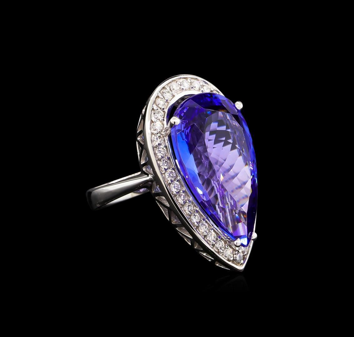 One electronically tested 14KT white gold lady's cast fashion ring with a basket halo with a bright polish finish. The featured lady's ring has a shank measuring 3.28 millimeters wide. Identified with markings of "K14". Condition is new, good workmanship. Containing: One prong set pear modified brilliant cut natural tanzanite, measuring 22.95 x 13.76 x 8.33mm, 4%. bulge factor, approximate weight of 18.42ct., clarity is eye clean, type I, medium, moderately strong, violetish blue color, (GIA vB 5/4), cut is excellent. Transmitting light with no distortion, transparent. Colored gemstones are presumed to have been subjected to commonly used enhancement processes. Graded in the setting. Thirty-Five prong set round brilliant cut diamonds, measuring 1.60 - 1.50 x 0.96mm (depth est.) approximate total weight of 35 Stones = 0.51ct. Graded in the setting. Clarity: VS-2 to SI-1. Color: H - I. Cut Good. Total Weight of Colored Stones 18.42ct. Total Weight of Diamonds 0.51ct. Total Weight of Ring 12.40gm. GAS Appraised.