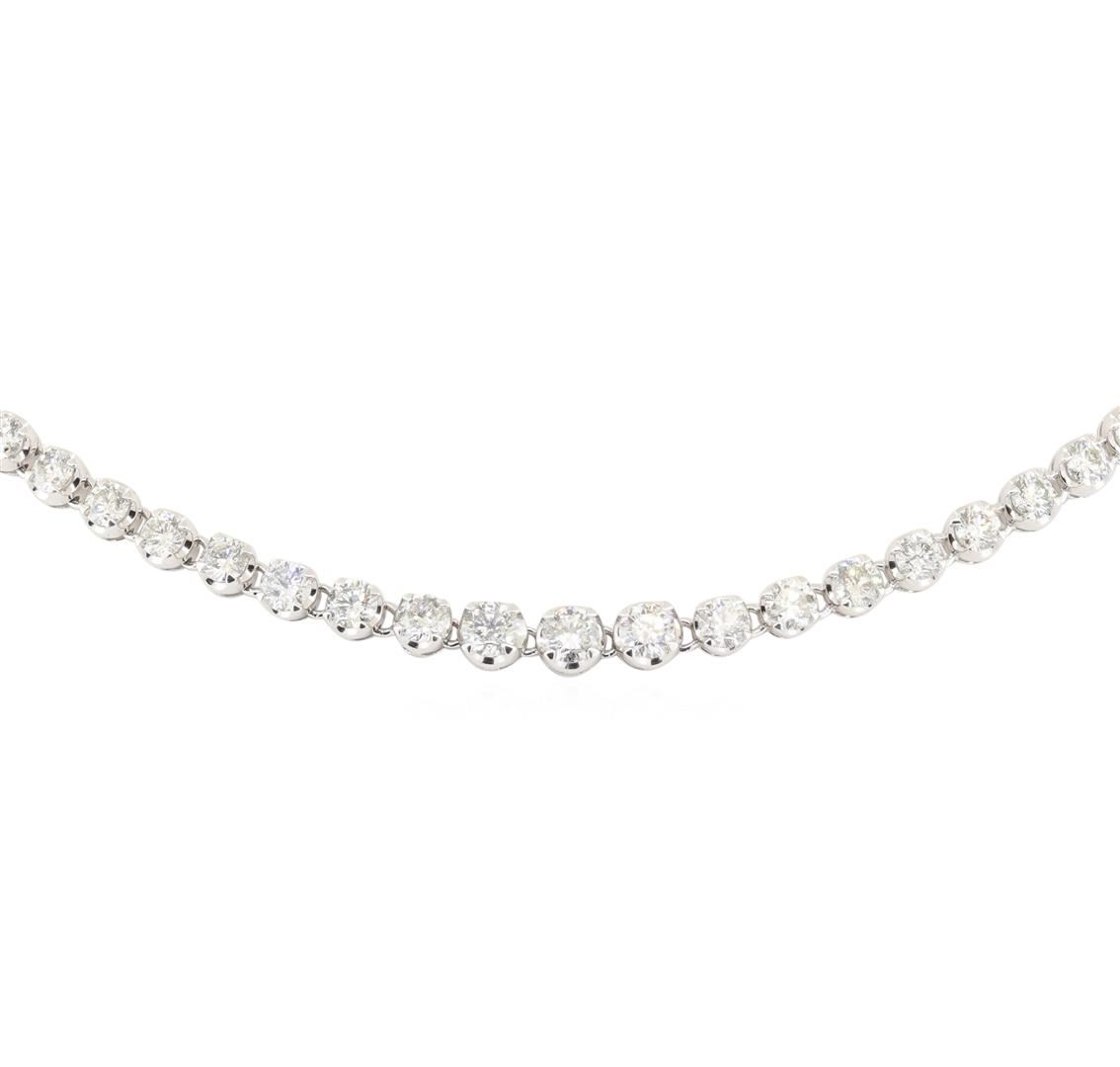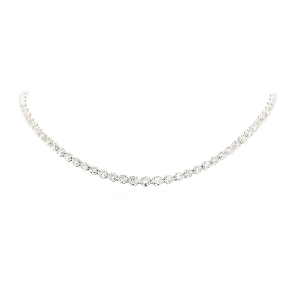 One electronically tested platinum ladies cast & assembled diamond tennis necklace. The seventeen inch length necklace is composed of a flexible ribbon of diamonds, terminating in a concealed clasp with twin safeties. Identified with markings of "PT950", & Trademark Orianne. Condition is new, good workmanship. Tennis bracelets & necklaces got their unusual name from an incident involving the U.S. professional tennis player Chris Evert during a tennis match in the 1980's. Evert had been wearing an expensive diamond bracelet, an inline string of individually set diamonds. Previously these bracelets were known as eternity bracelets. When the clasp snapped during play, she asked the officials to stop the tennis match until the bracelet could be found. Since that day, bracelets and necklaces featuring an inline string of diamonds have been called tennis bracelets and tennis necklaces. Containing: Eighty-Three prong set round brilliant cut diamonds, measuring 4.70 - 2.80 x 2.25mm (depth est.) approximate total weight of 83 Stones = 18.46ct. Graded in the setting. Clarity I-1 to I-2 Color F - H Total Weight of Diamonds 18.46 ct. Total Weight of Necklace 39.56 gm Estimated Retail Value $ 54,995.00 US