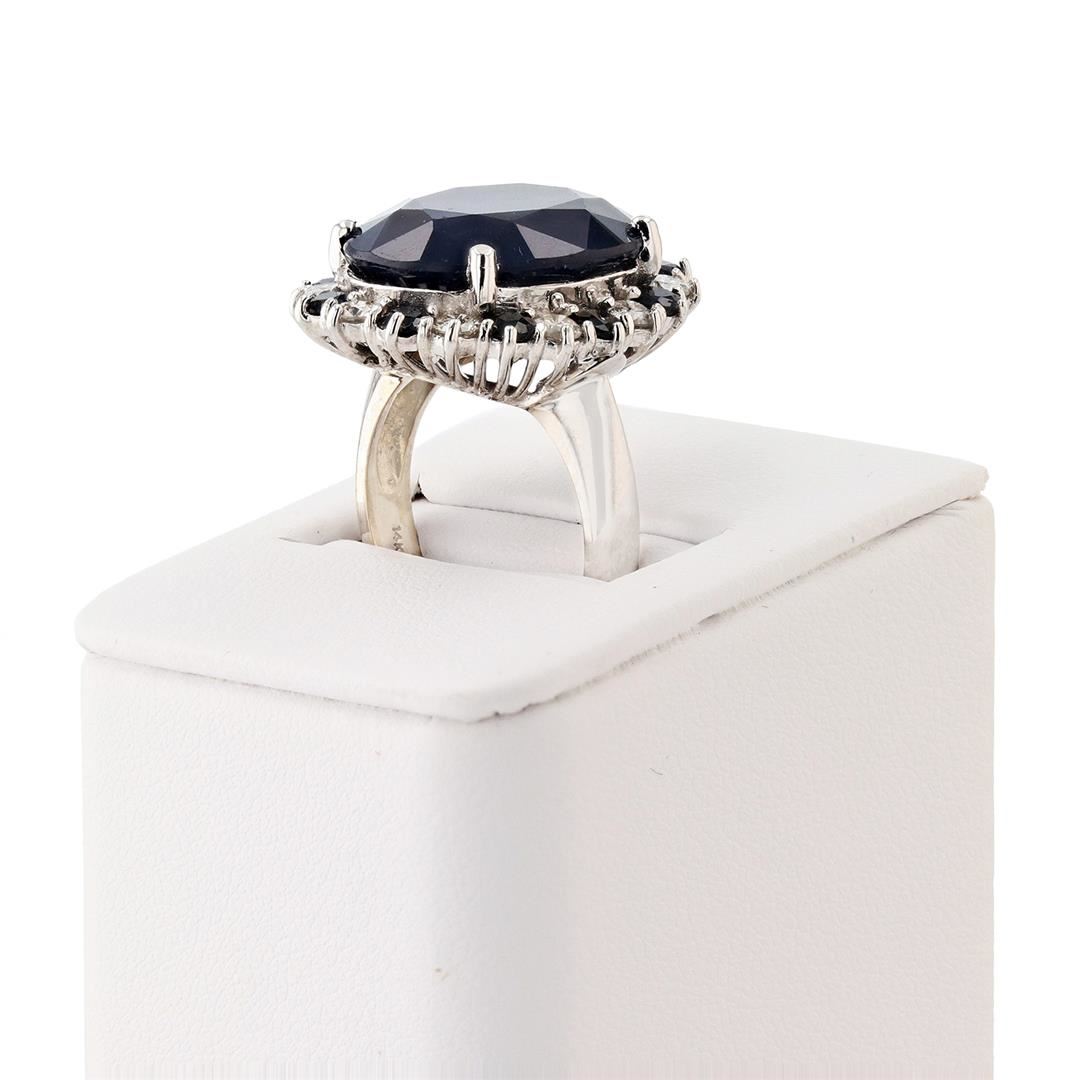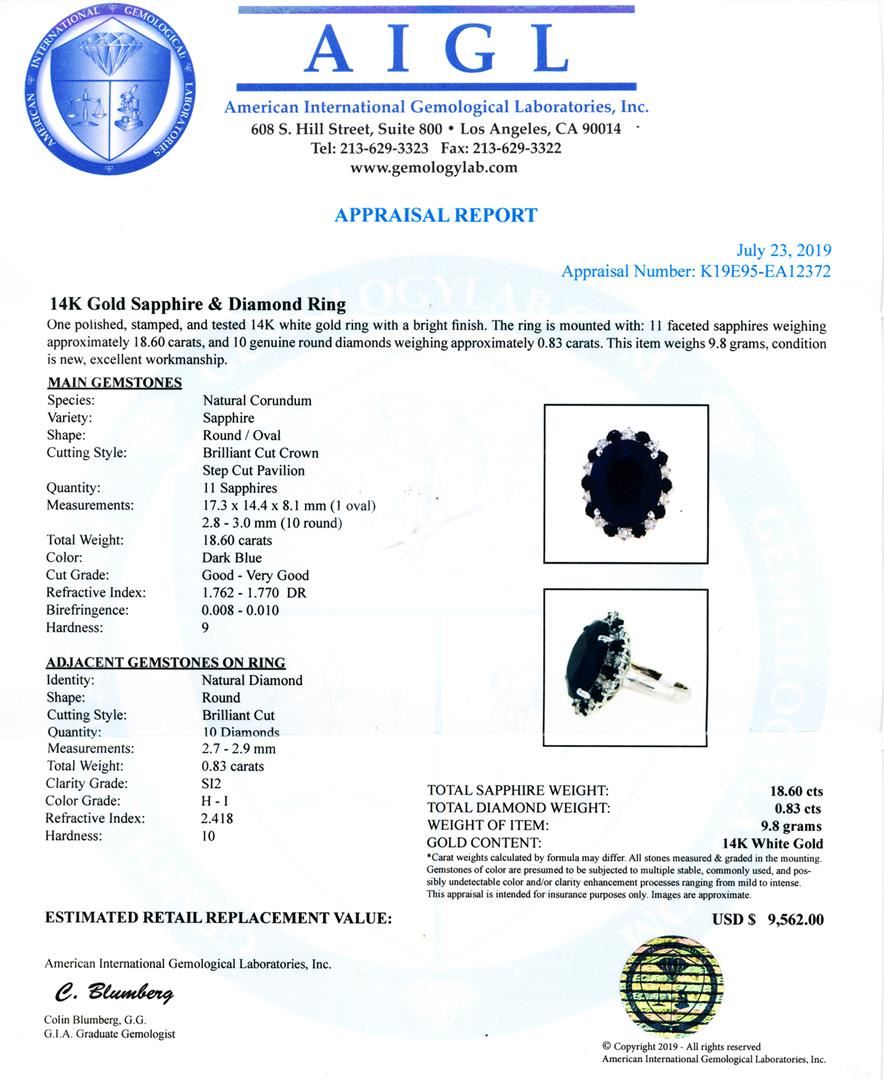 14K Gold Sapphire & Diamond Ring One polished, stamped, and tested 14K white gold ring with a bright finish. The ring is mounted with: 11 faceted sapphires weighing approximately 18.60 carats, and 10 genuine round diamonds weighing approximately 0.83 carats. This item weighs 9.8 grams, condition is new, excellent workmanship. MAIN GEMSTONES Species: Natural Corundum Variety: Sapphire Shape: Round / Oval Cutting Style: Brilliant Cut Crown Step Cut Pavilion Quantity: 11 Sapphires Measurements: 17.3 x 14.4 x 8.1 mm (1 oval) 2.8 - 3.0 mm (10 round) Total Weight: 18.60 carats Color: Dark Blue Cut Grade: Good - Very Good Refractive Index: 1.762 - 1.770 DR Birefringence: 0.008 - 0.010 Hardness: 9 ADJACENT GEMSTONES ON RING Identity: Natural Diamond Shape: Round Cutting Style: Brilliant Cut Quantity: 10 Diamonds Measurements: 2.7 - 2.9 mm Total Weight: 0.83 carats Clarity Grade: SI2 Color Grade: H - I Refractive Index: 2.418 Hardness: 10 TOTAL SAPPHIRE WEIGHT: 18.60ctw TOTAL DIAMOND WEIGHT: 0.83ctw WEIGHT OF ITEM: 9.8 grams GOLD CONTENT: 14K White Gold