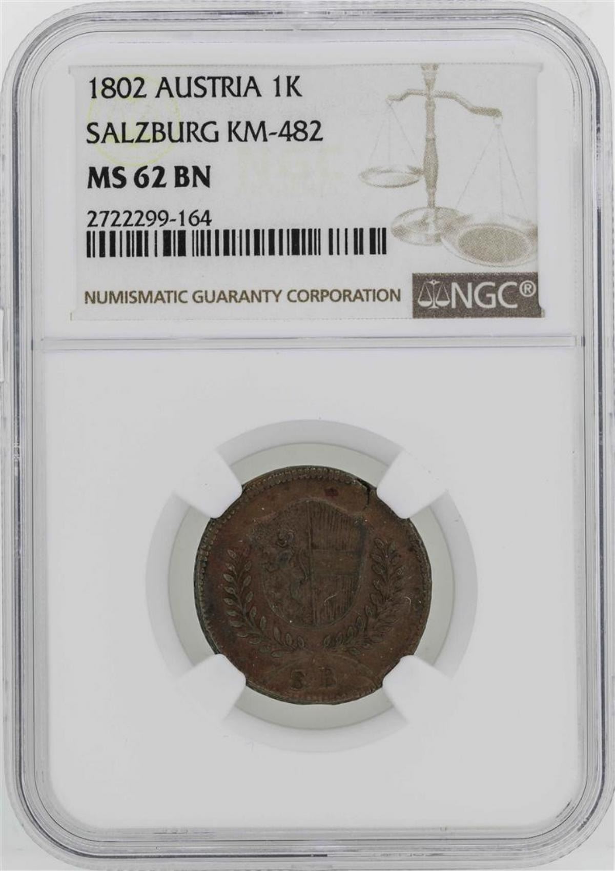 One 1802 Austria Salzburg Kreuzer Coin NGC MS62BN. NGC Certified.