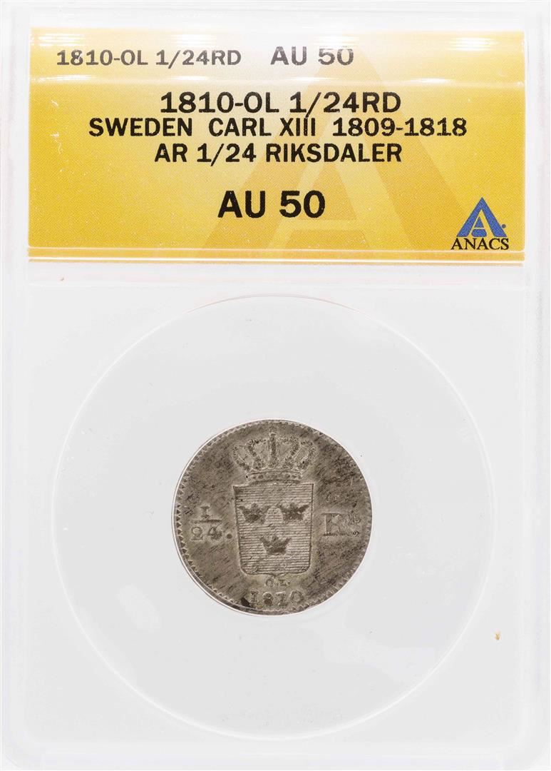 One 1810-OL Sweden Carl XIII AR 1/24 Riksdaler Coin ANACS AU50. ANACS Appraised.