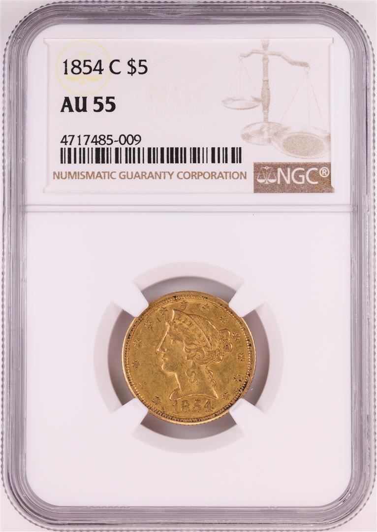 One 1854-C $5 Liberty Head Half Eagle Gold Coin NGC AU55.