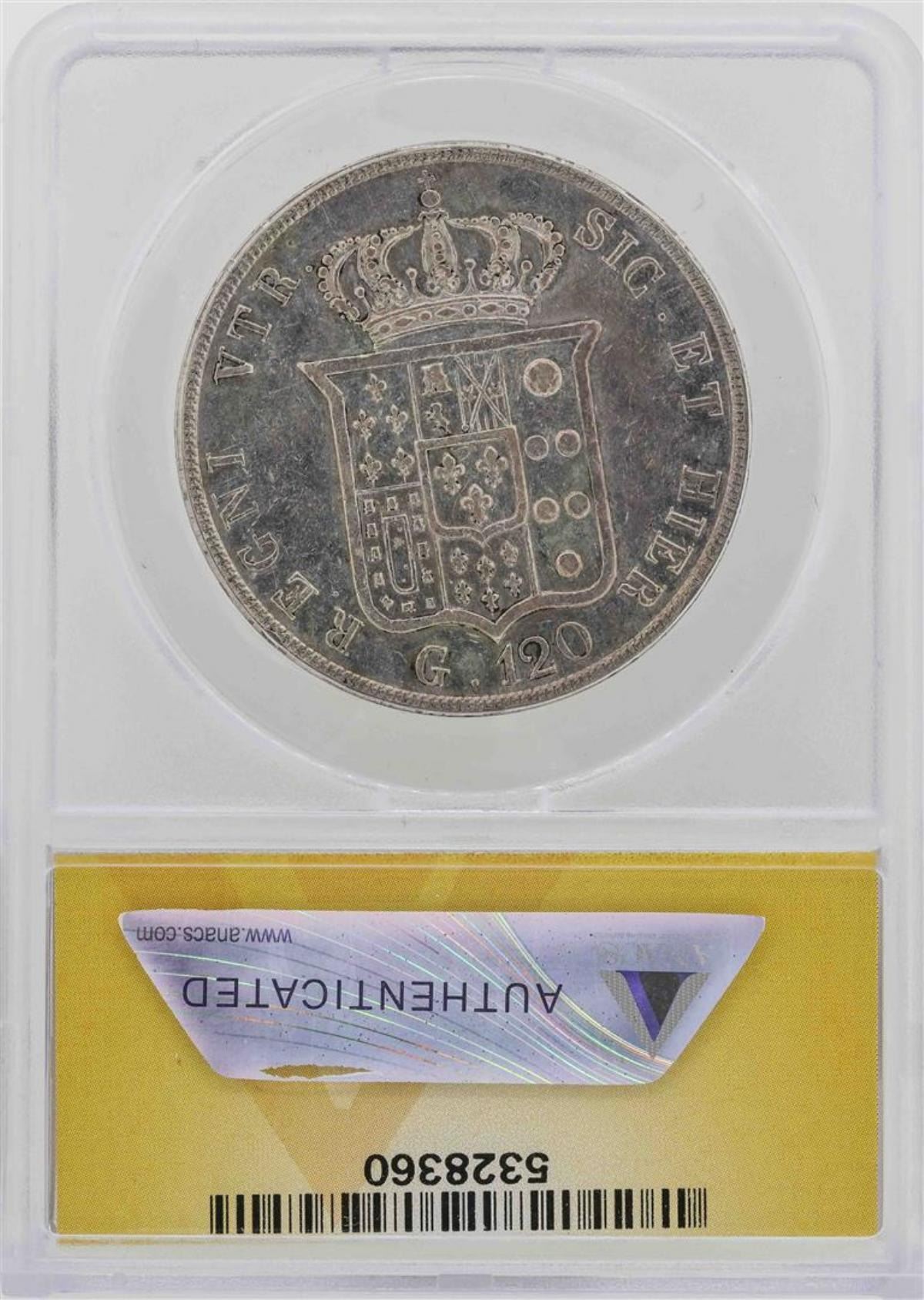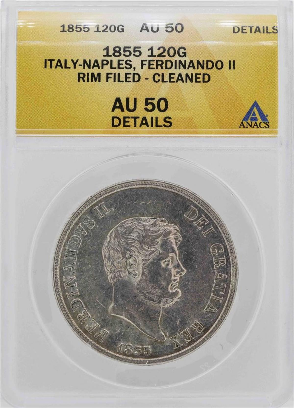 One 1855 Italy-Naples Ferdinando II 120 Grana Coin ANACS AU50 Details. ANACS Appraised.
