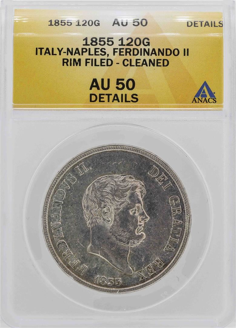 One 1855 Italy-Naples Ferdinando II 120 Grana Coin ANACS AU50 Details. ANACS Appraised.
