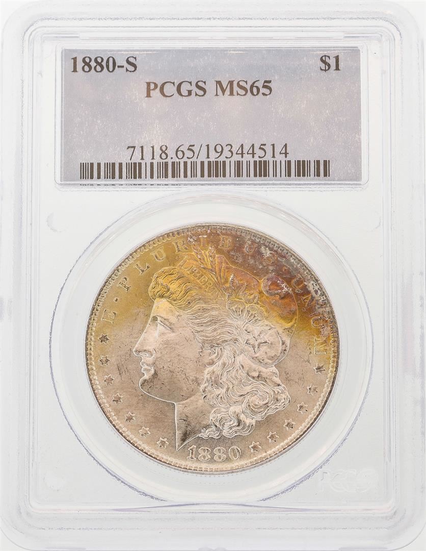 One 1880-S $1 Morgan Silver Dollar Coin PCGS MS65 AMAZING TONING. PCGS Certified.