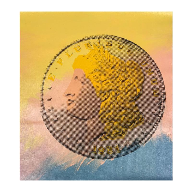 "1881 Coin" is a limited edition hand pulled silkscreen mixed media on canvas by Andy Warhol protege Steve Kaufman (1960-2010). This piece is numbered and AP 28/50 and hand signed inverso. Includes letter of authenticity. As is common with Kaufman's works, this piece may have perceived minor flaws, but is in overall good condition. Measures approximately 15" x 14" (image).