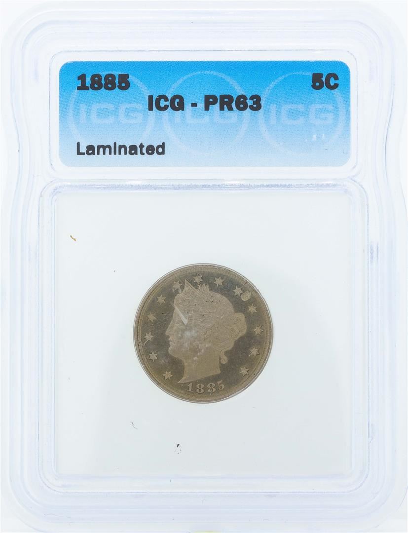 One 1885 Liberty Head Proof Nickel Coin ICG PR63 Laminated. ICG Appraised.