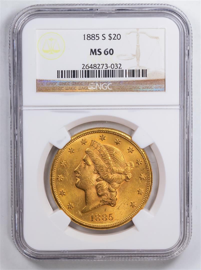 One 1885-S $20 Saint-Gaudens Double Eagle Gold Coin NGC MS60.