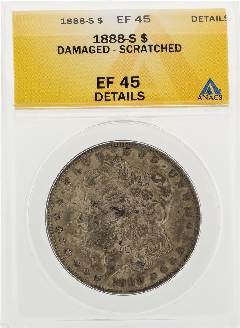 One 1888-S $1 Morgan Silver Dollar Coin Damaged Scratched ANACS EF45 Details. ANACS Appraised.