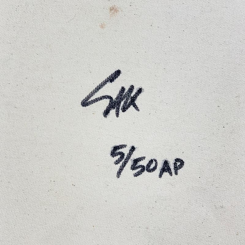 1896 $2.00 Silver Certificate is a limited edition hand pulled silkscreen mixed media on canvas by Andy Warhol protege Steve Kaufman (1960-2010). This piece is numbered and AP 5/50 and hand signed inverso. Includes letter of authenticity. As is common with Kaufman's works, this piece may have perceived minor flaws, but is in overall good condition. Measures approximately 18" x 34.5" (image).