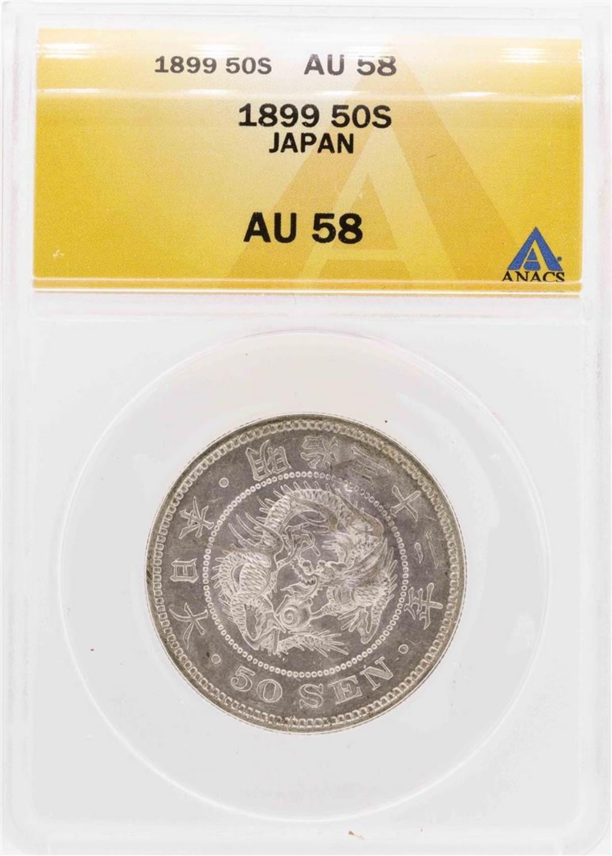 One 1899 Japan 50 Sen Coin ANACS AU58. ANACS Appraised.