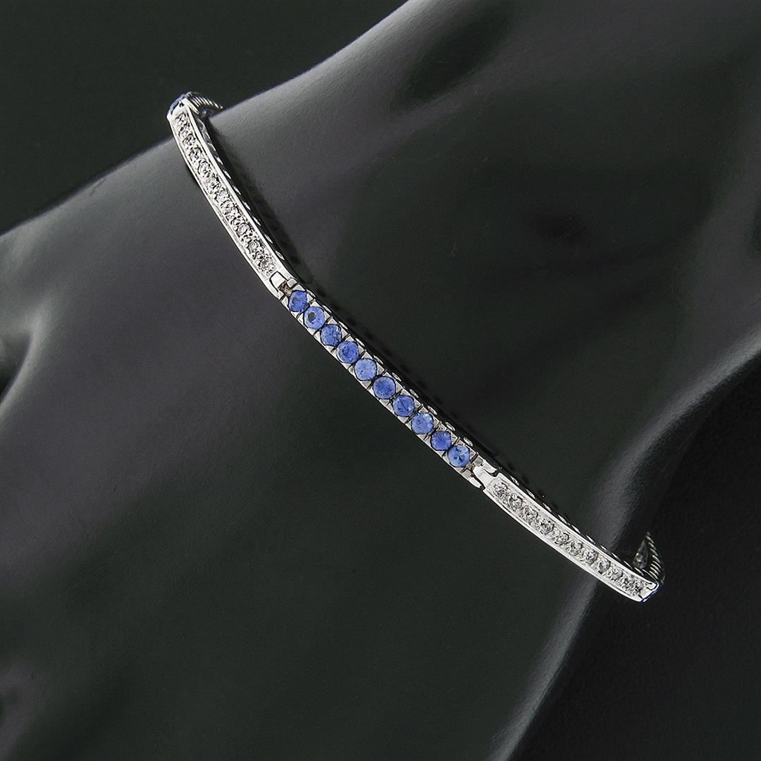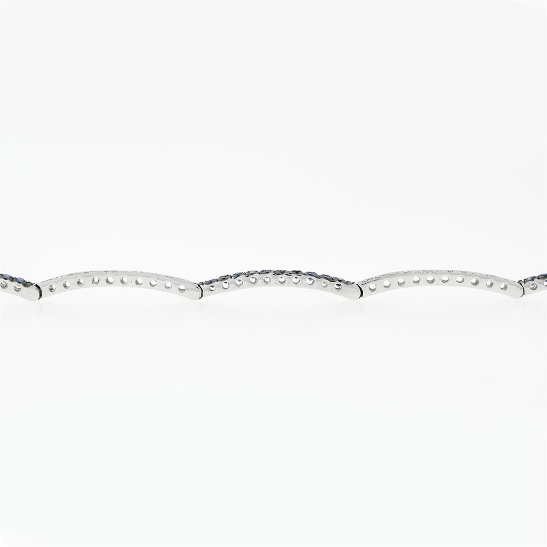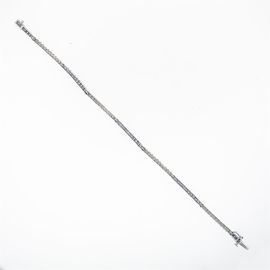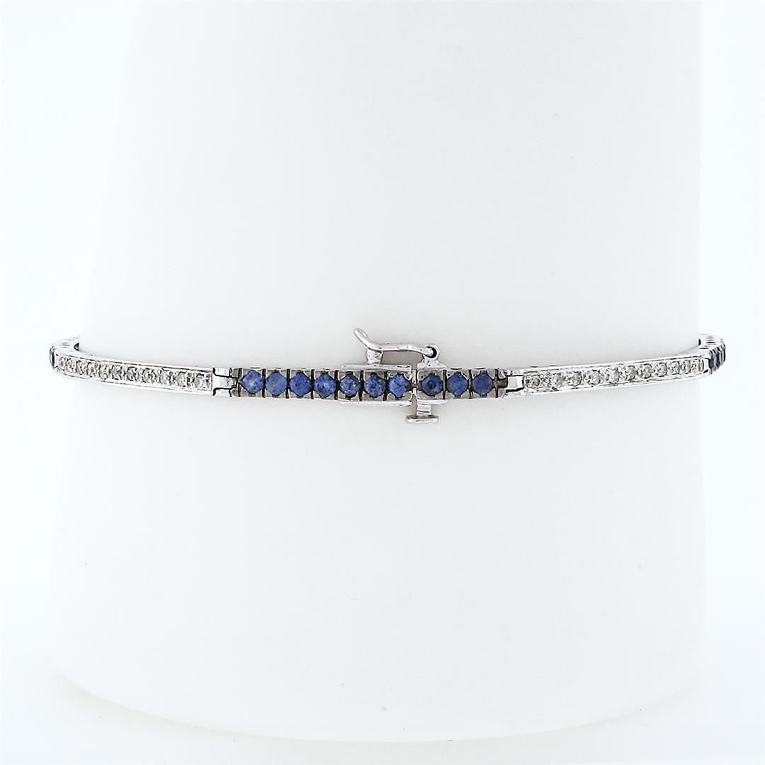 A solid 18k white gold with blackended gold prongs tennis line bracelet, with 44 round brilliant cut natural diamonds (G/H- SI1/SI2; 0.44ctw), & 40 round brilliant cut natural sapphires (1.00ctw). It weighs a total of 7.16 grams, measures 2.40mm wide, and measures 7 inches in length.