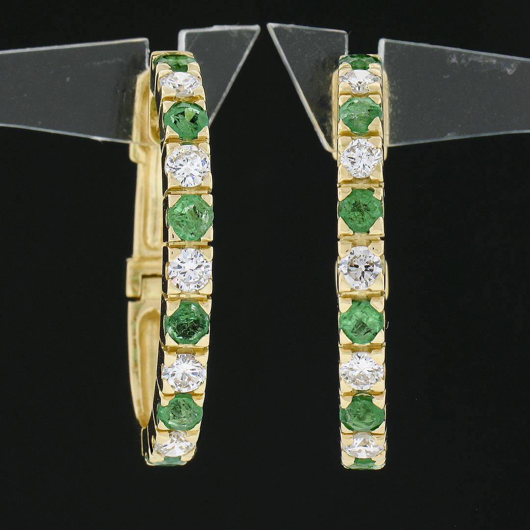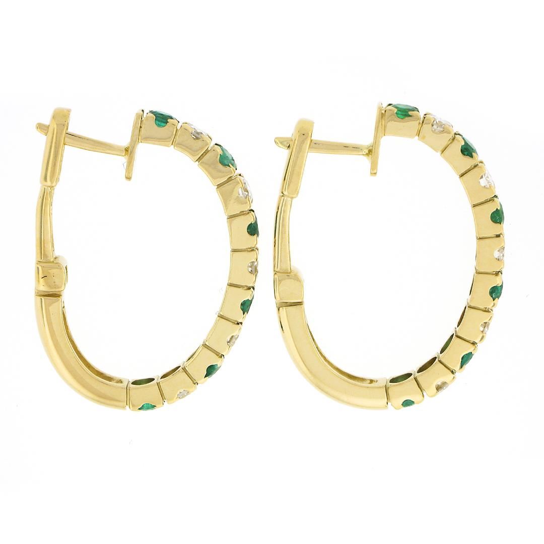 A solid 18k yellow gold hoop earrings. with 10 round brilliant cut natural diamonds (G/H - VS1/VS2 ; 1.15ctw), and 12 round brilliant cut natural emeralds (1.59ctw). The earrings measure approximately 30.60x3.4mm and weigh a total of 11.66 grams.