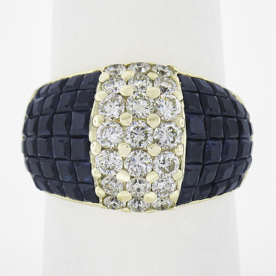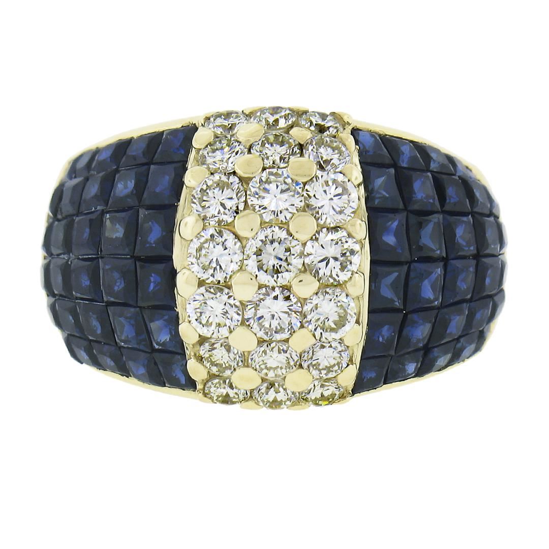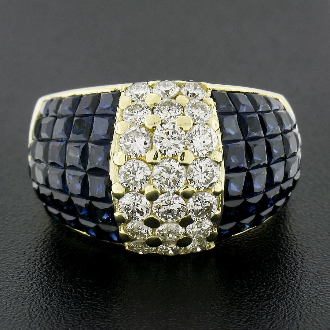 A solid 18k yellow gold wide band ring, with 60 square cut natural sapphires (3-4ctw ), and 21 round cut natural diamonds ( H/I - VS1/VS2 ; 1.23ctw). The ring is size 7.5, weighs a total of 10.97 grams, and measures 13.9mm wide.