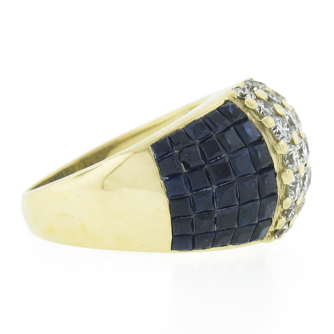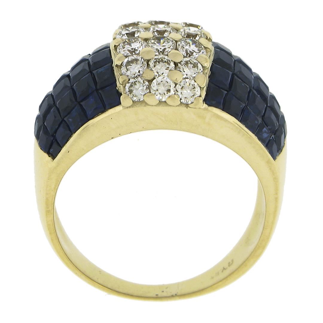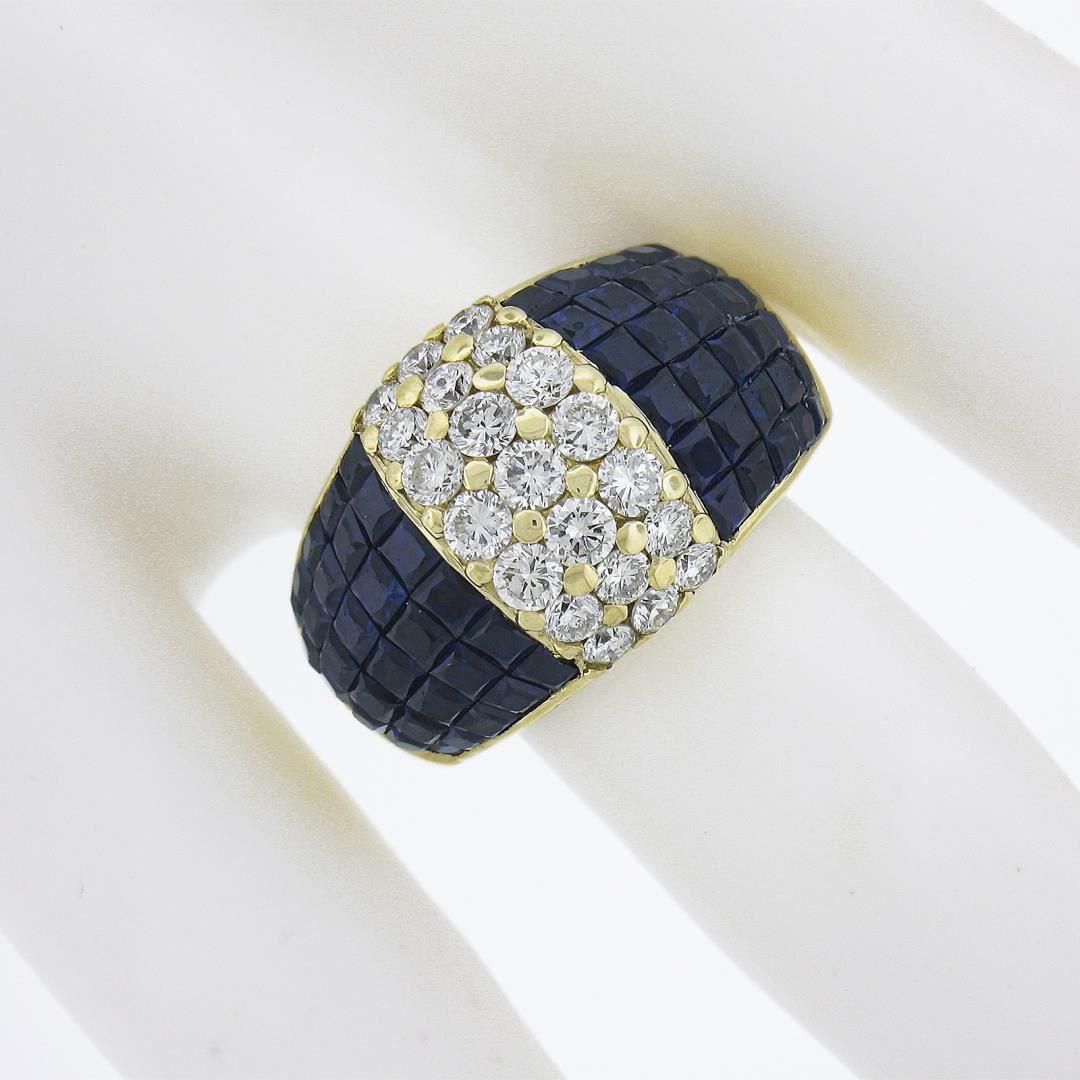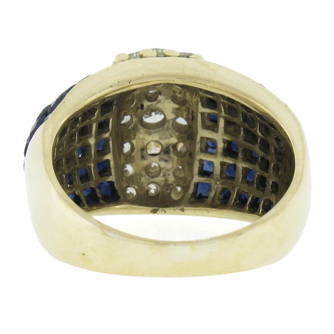 A solid 18k yellow gold wide band ring, with 60 square cut natural sapphires (3-4ctw ), and 21 round cut natural diamonds ( H/I - VS1/VS2 ; 1.23ctw). The ring is size 7.5, weighs a total of 10.97 grams, and measures 13.9mm wide.